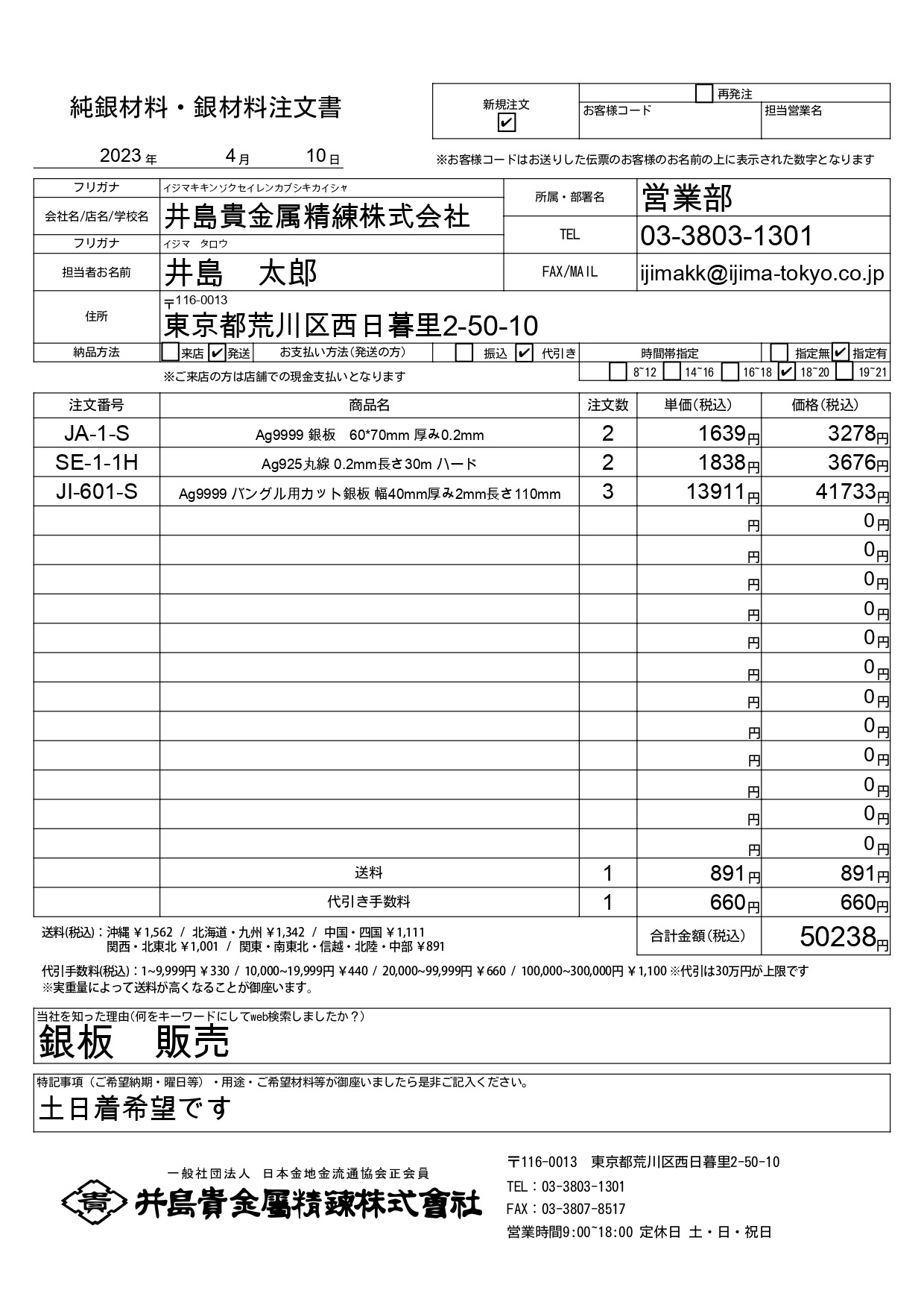◆ 井島貴金属精錬株式会社:FAXの銀板・銀線 注文書 ◆