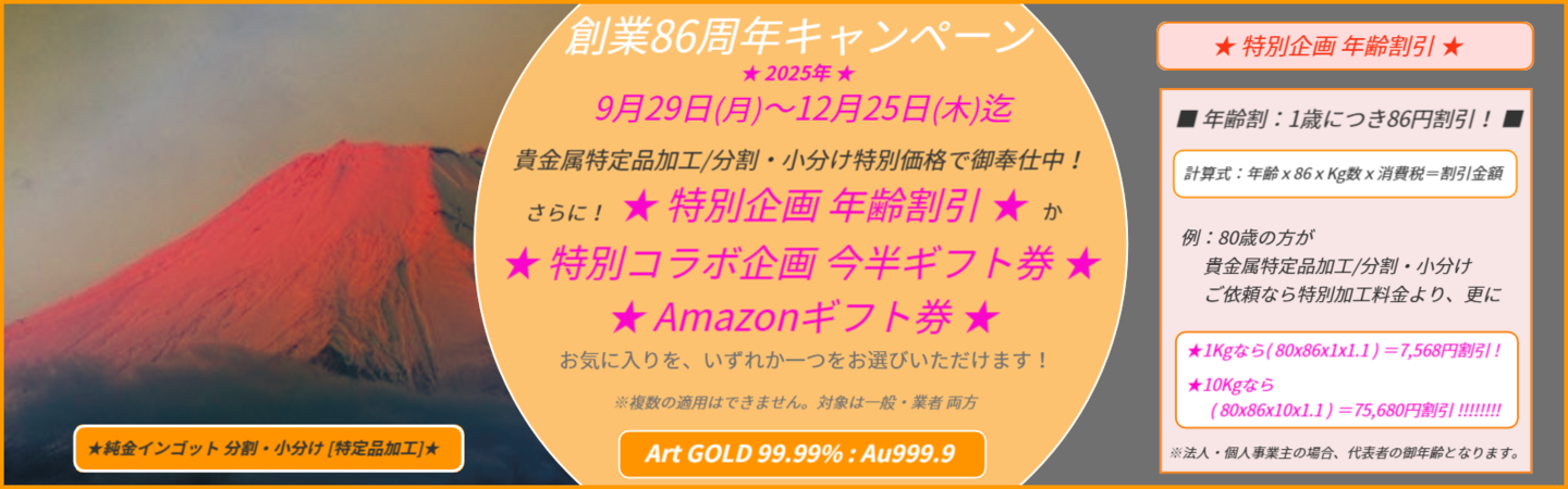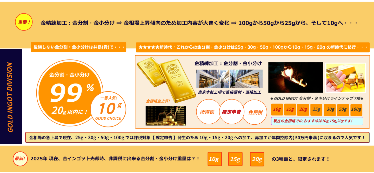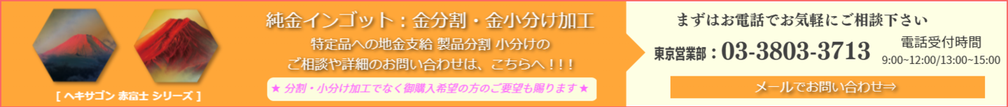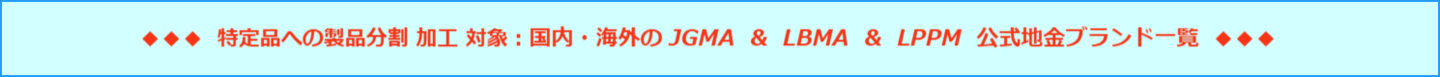 ※企画の立上げ約10年間はJGMA正会員の当社、井島貴金属精錬の金インゴットの金分割 金小分け、田中貴金属工業の金インゴットの金分割 金小分け、徳力本店の金インゴットの金分割 金小分け、石福金属興業の金インゴットの金分割 金小分け、その他JGMA正会員の金インゴットの金分割 金小分け、賛助会員の三菱マテリアルの金インゴットの金分割 金小分けとスイスクレジットの金インゴットの金分割 金小分け、スイスバンクの金インゴットの金分割 金小分けと限定ブランドを設けておりましたが、現在は JGMA・LBMA 全てのブランドの金インゴットが金分割 金小分けの対象となっており、純度99.99%の純金であれば、純金板材・純金インゴットのほぼ全ての国内・海外 金地金インゴット ブランドが純金インゴット精錬加工/純金分割・純金小分け加工の対象となっております。