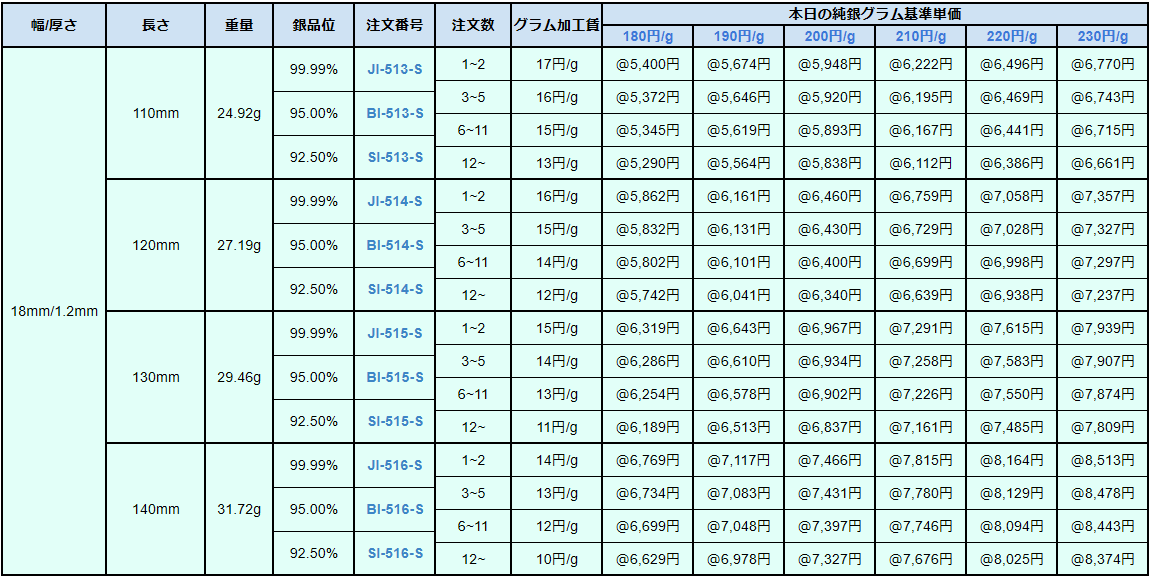 バングル用カット銀板ⅩⅡ(10mm~20mm)バングル用純銀板・バングル用950銀板・バングル用925銀板:井島貴金属精錬株式会社