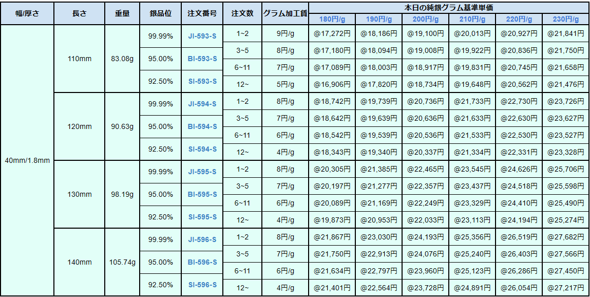 バングル用カット銀板ⅩⅧ(幅40mm)バングル用純銀板・バングル用950銀板・バングル用925銀板:井島貴金属精錬株式会社