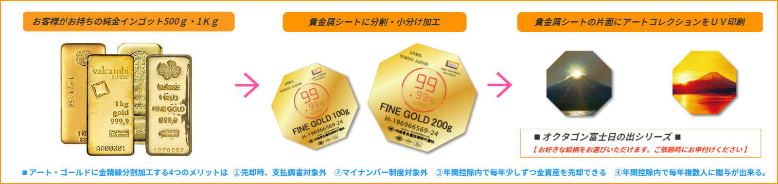 ★ お客様がお持ちの500g・1kg 純金インゴットを分割・小分け加工し、50g・100g・200g・250gの 特定品アート コレクション シートに!