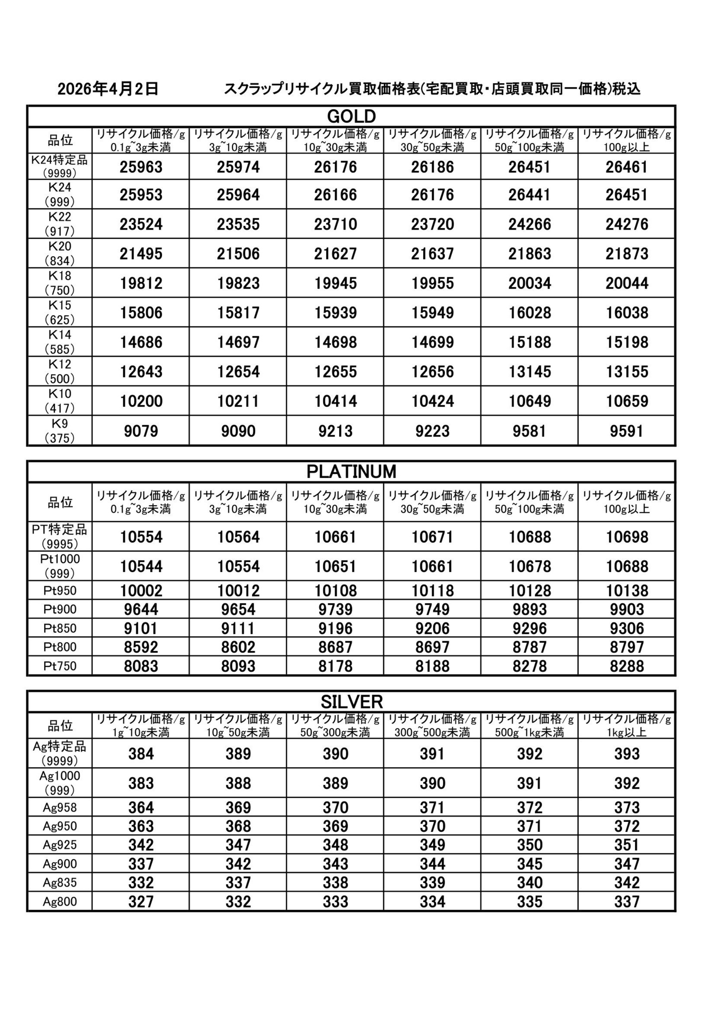 ※下記価格は宅配買取・店頭買取における金製品0.1g・プラチナ製品0.1g・銀製品1g以上に対しての適用価格(税込)です