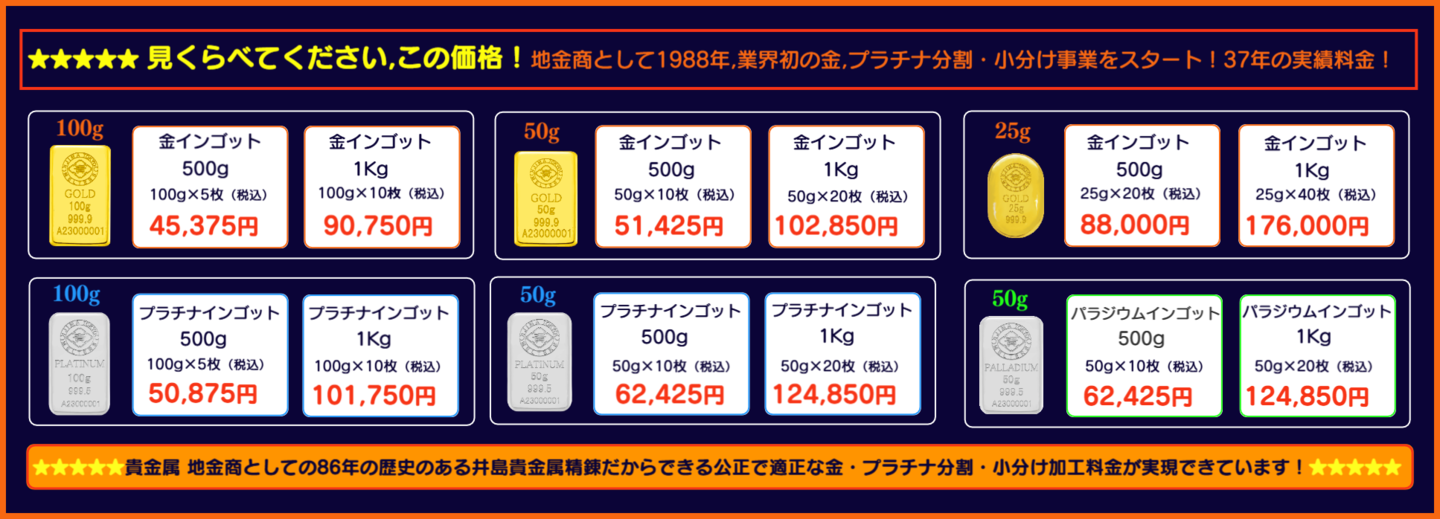 ★お薦めです!金インゴット:分割・小分け / プラチナ インゴット:分割・小分け…最善の方法を提案する井島貴金属の金・プラチナの分割・小分け加工をぜひ,ご利用ください!★