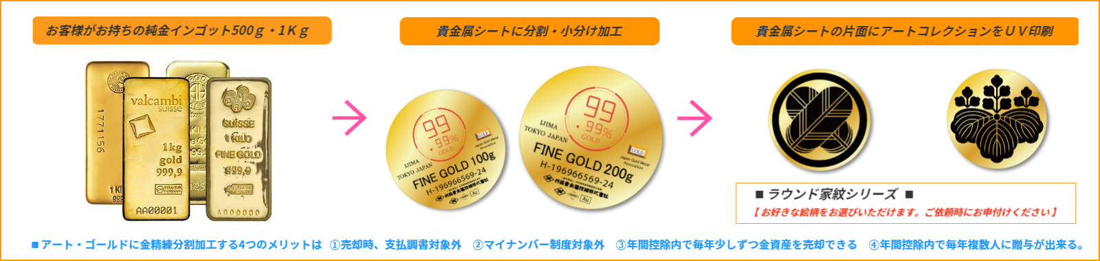★ お客様がお持ちの500g・1kg 純金インゴットを分割・小分け加工し、50g・100g・200g・250gの 特定品アート コレクション シートに!