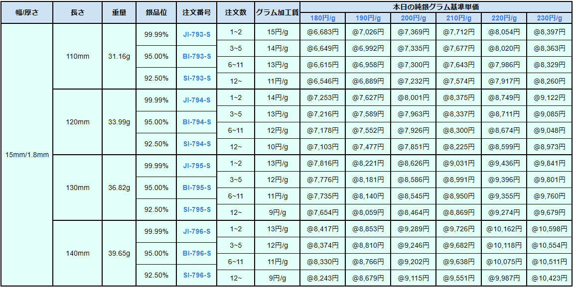 シルバー9999、シルバー950、シルバー925ソフトシートの販売価格は、4N純銀をベースに計算されています。950銀、925銀は同一価格での販売となります。