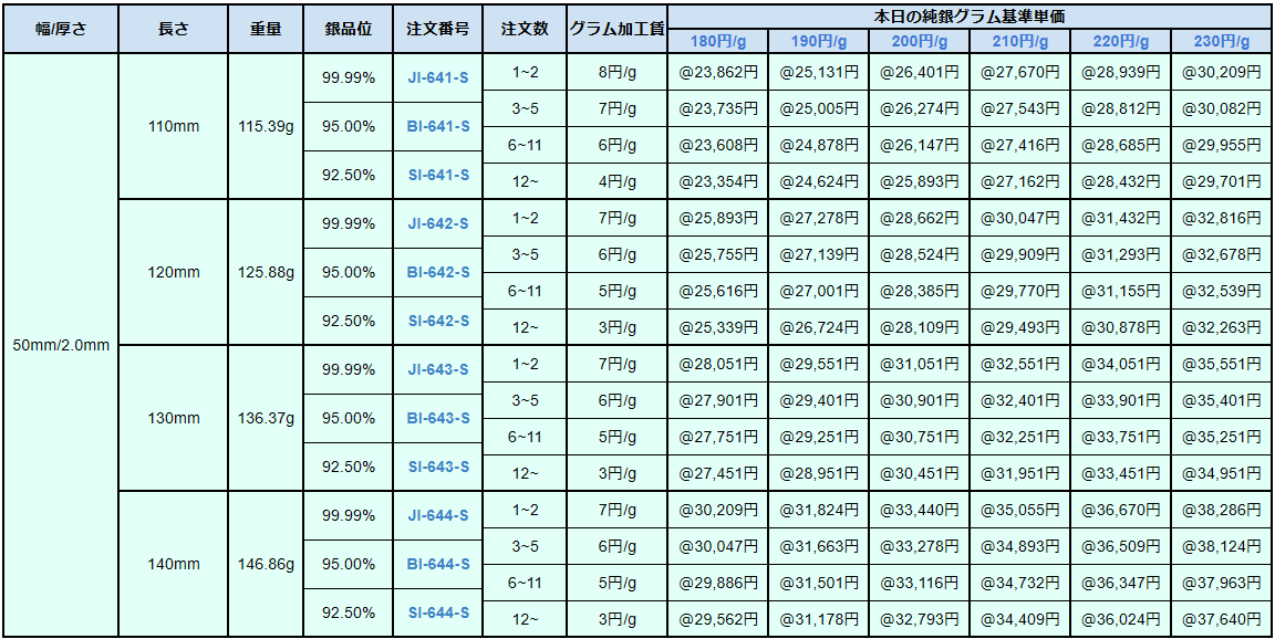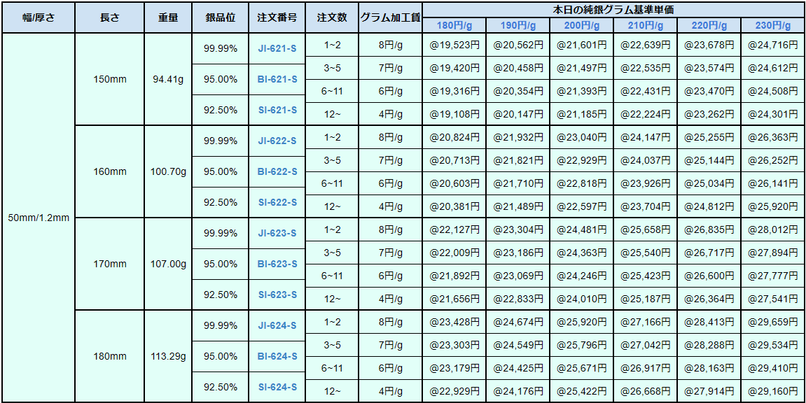 シルバー9999、シルバー950、シルバー925ソフトシートの販売価格は、4N純銀をベースに計算されています。950銀、925銀は同一価格での販売となります。