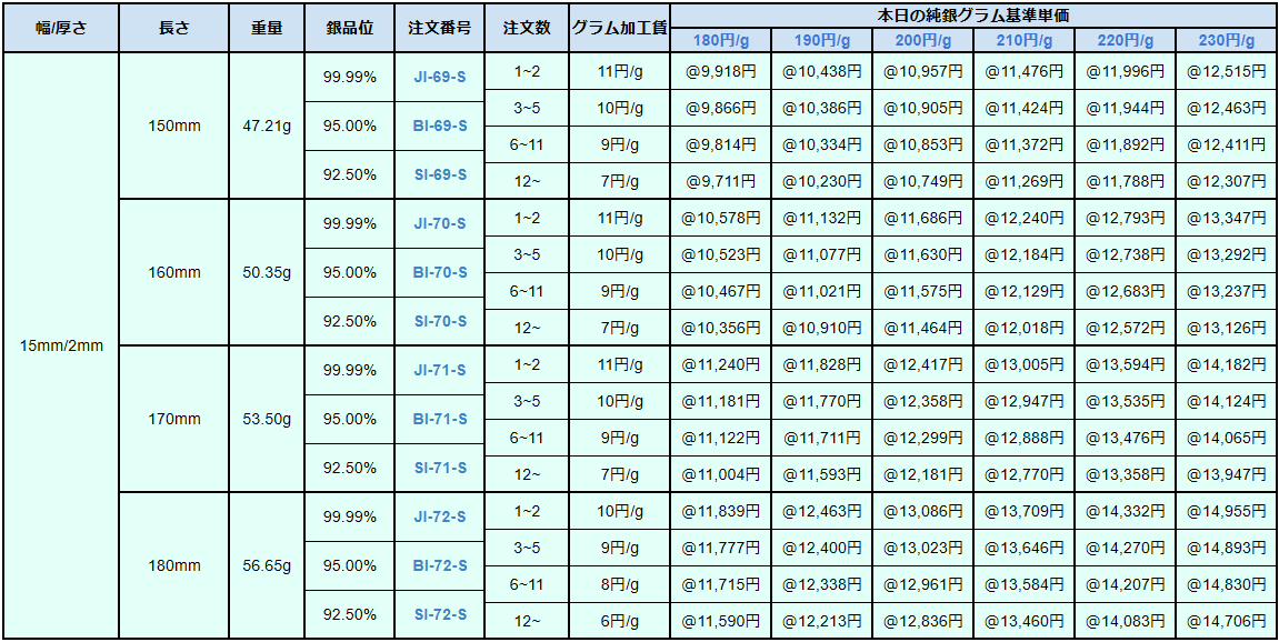 バングル用カット銀板Ⅱ(10mm~20mm)バングル用純銀板・バングル用950銀板・バングル用925銀板:井島貴金属精錬株式会社