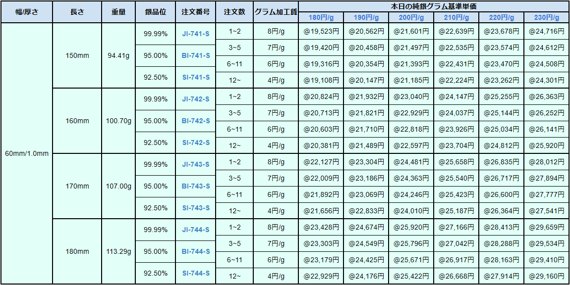 シルバー9999、シルバー950、シルバー925ソフトシートの販売価格は、4N純銀をベースに計算されています。950銀、925銀は同一価格での販売となります。