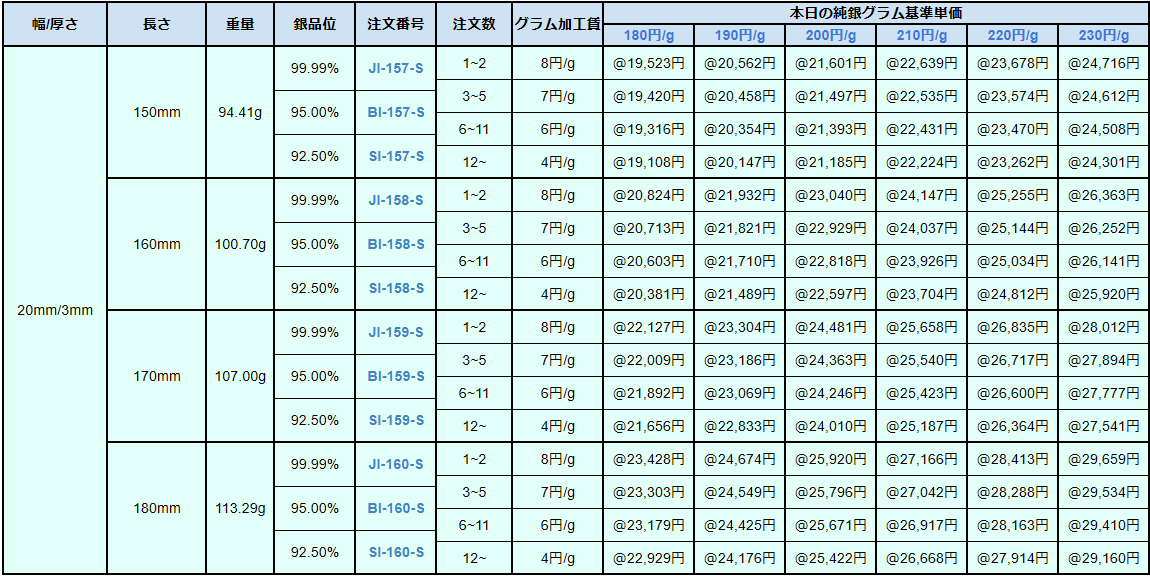 シルバー9999、シルバー950、シルバー925ソフトシートの販売価格は、4N純銀をベースに計算されています。950銀、925銀は同一価格での販売となります。
