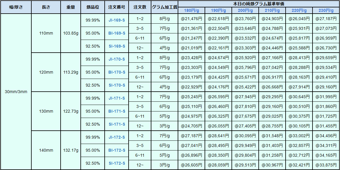 ※重量は4N純銀の比重(10.49)で計算しています。重量は計算重量のため実際の重量とは多少異なります。