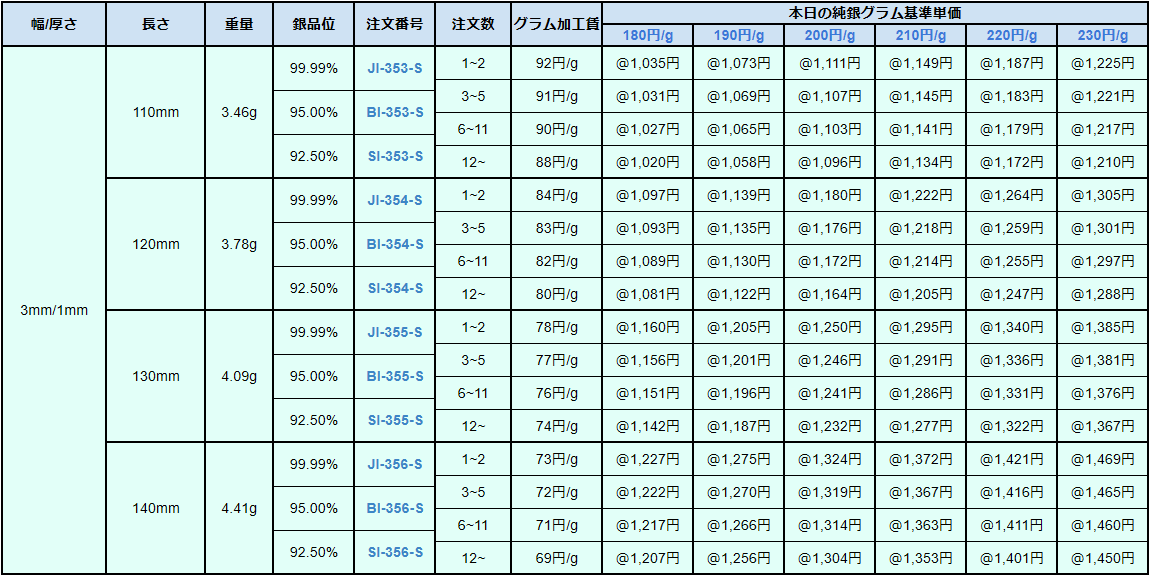 ※重量は4N純銀の比重(10.49)で計算しています。重量は計算重量のため実際の重量とは多少異なります。
