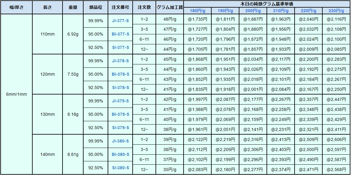 シルバー9999、シルバー950、シルバー925ソフトシートの販売価格は、4N純銀をベースに計算されています。950銀、925銀は同一価格での販売となります。