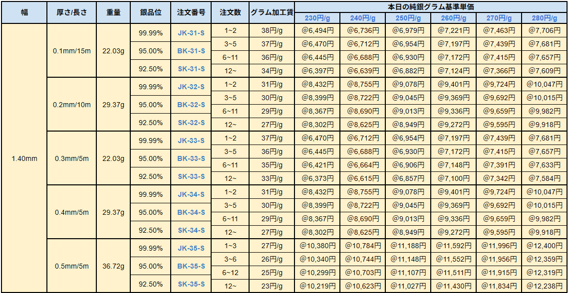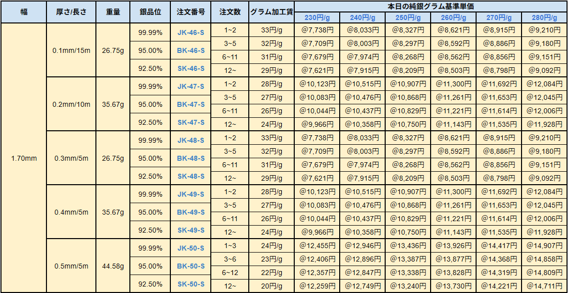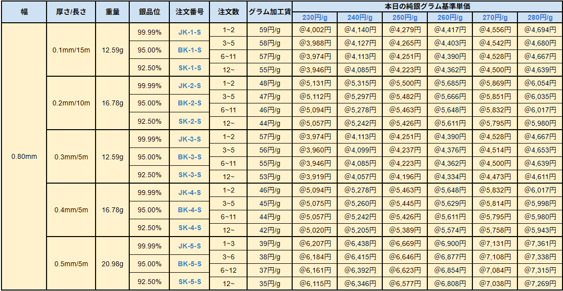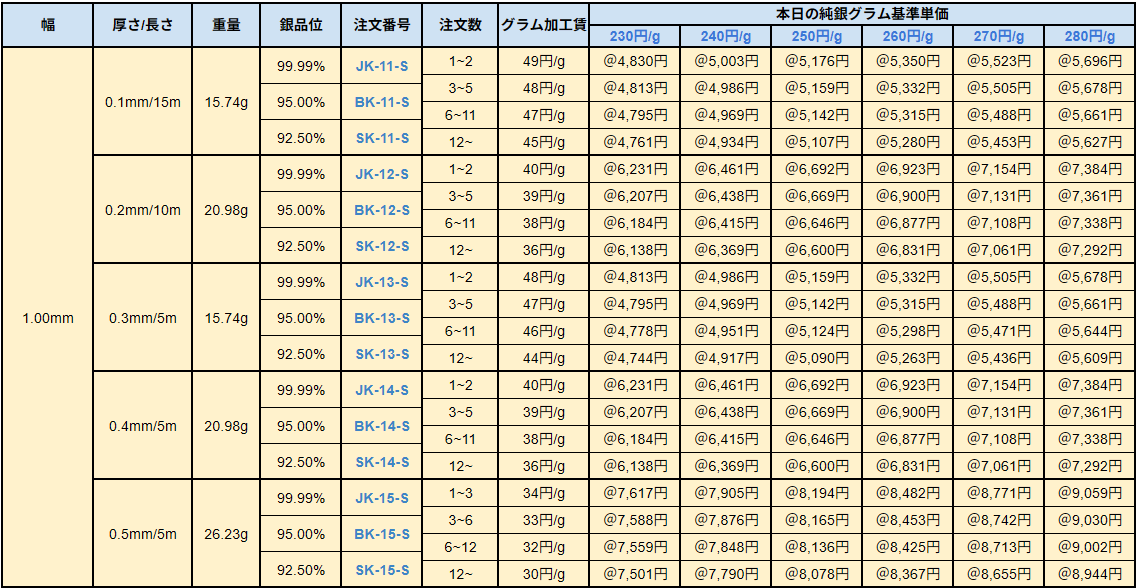 シルバー9999、シルバー950、シルバー925ソフトシートの販売価格は、4N純銀をベースに計算されています。950銀、925銀は同一価格での販売となります。