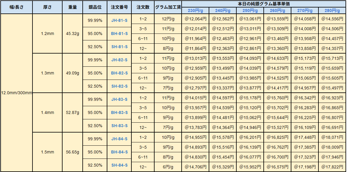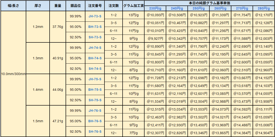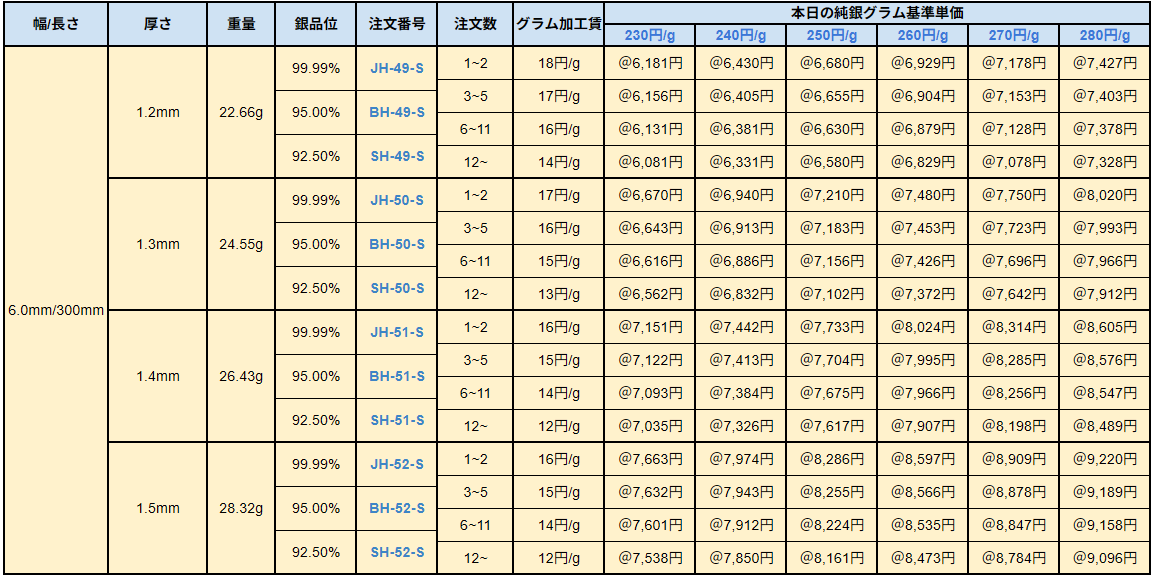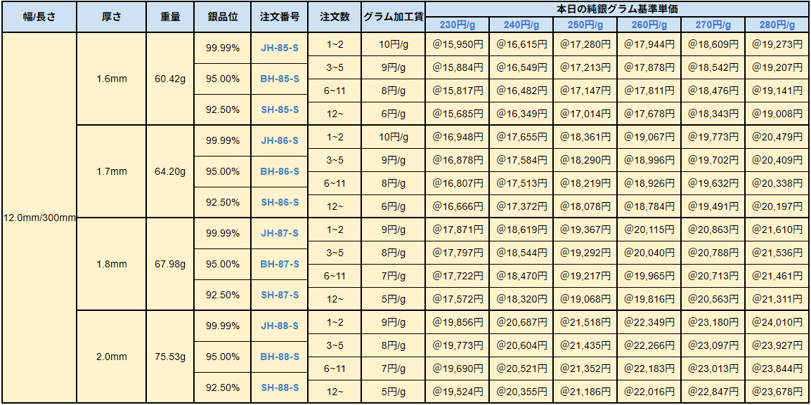 シルバー9999、シルバー950、シルバー925ソフトシートの販売価格は、4N純銀をベースに計算されています。950銀、925銀は同一価格での販売となります。