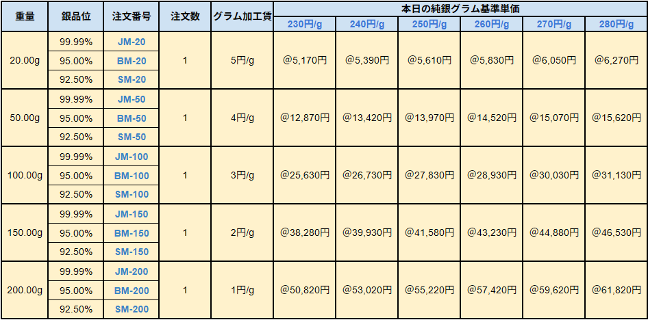 ※重量は4N純銀の比重(10.49)で計算しています。重量は計算重量のため実際の重量とは多少異なります。