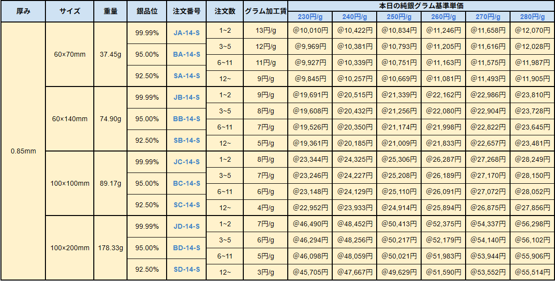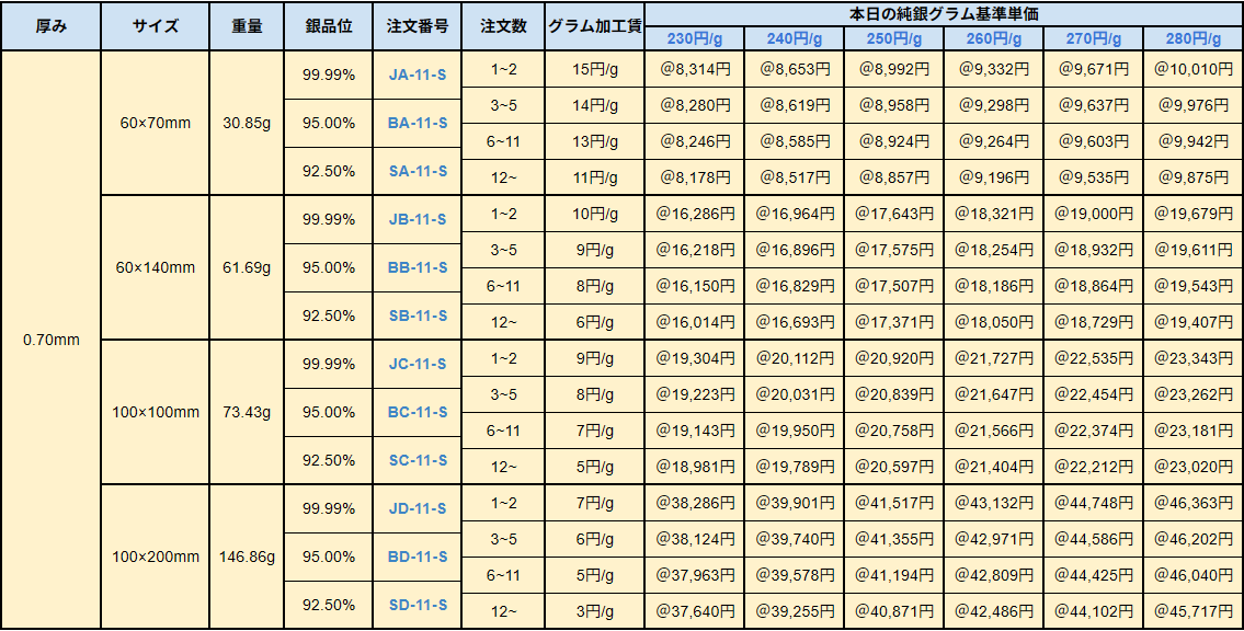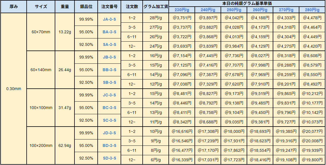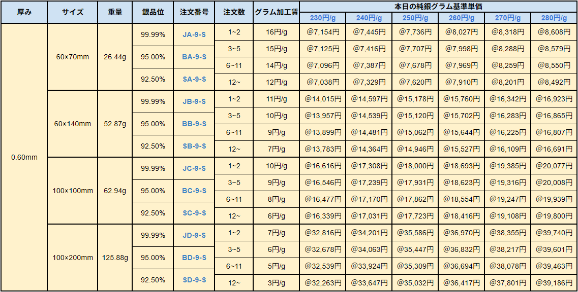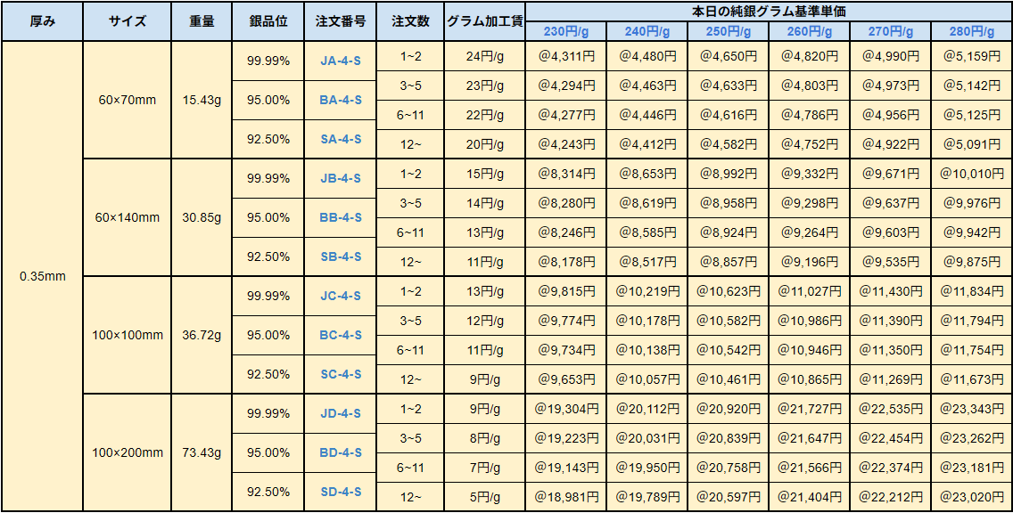 シルバー9999、シルバー950、シルバー925ソフトシートの販売価格は、4N純銀をベースに計算されています。950銀、925銀は同一価格での販売となります。
