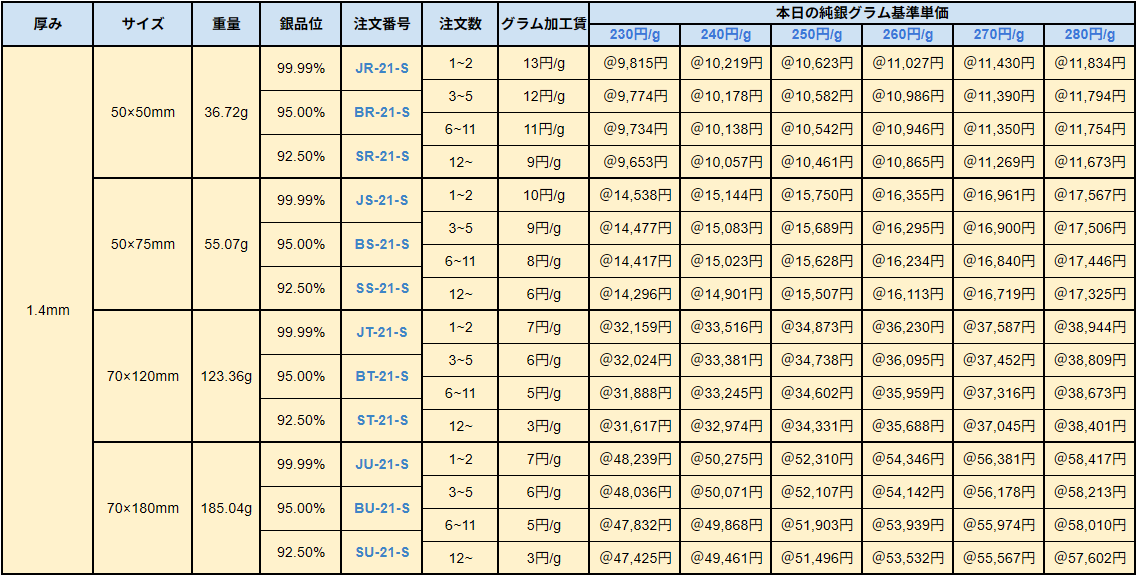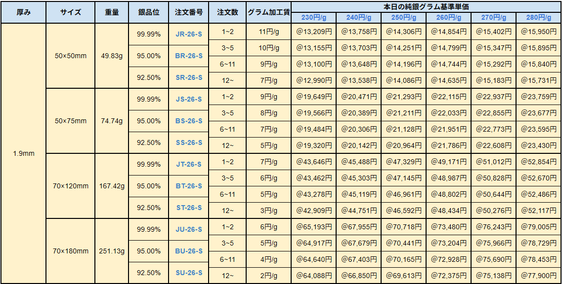 シルバー9999、シルバー950、シルバー925ソフトシートの販売価格は、4N純銀をベースに計算されています。950銀、925銀は同一価格での販売となります。