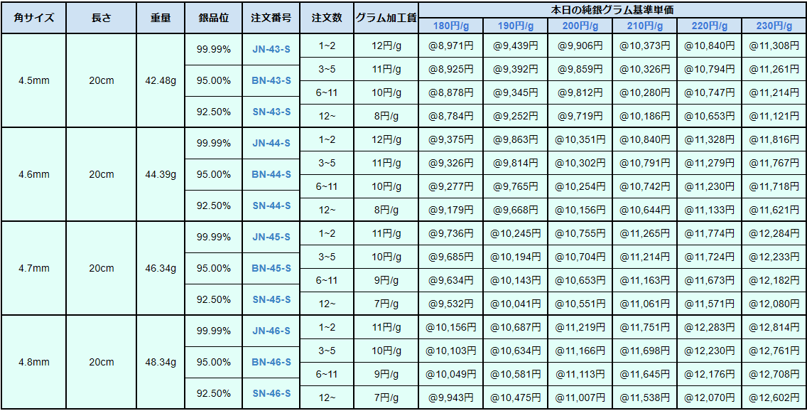 ※重量は4N純銀の比重(10.49)で計算しています。重量は計算重量のため実際の重量とは多少異なります。