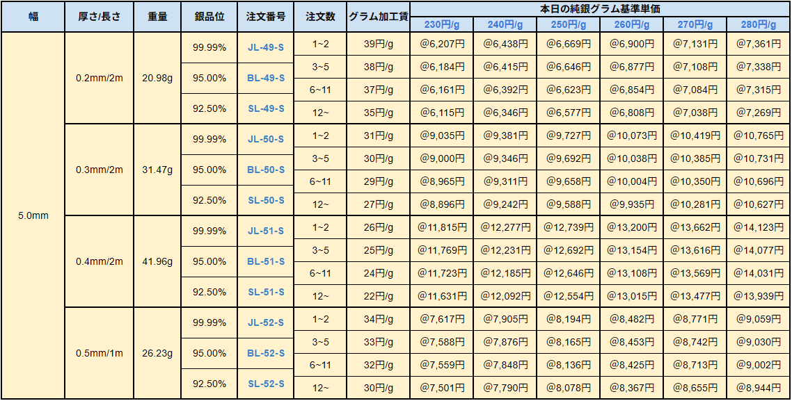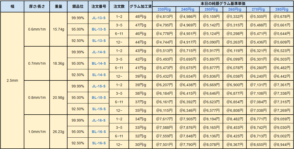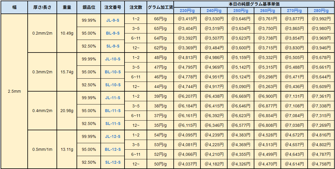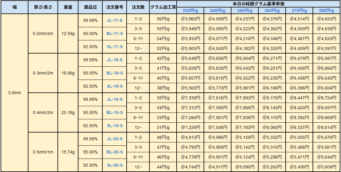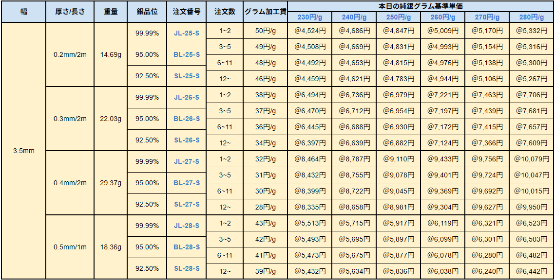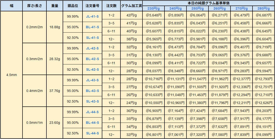 シルバー9999、シルバー950、シルバー925ソフトシートの販売価格は、4N純銀をベースに計算されています。950銀、925銀は同一価格での販売となります。