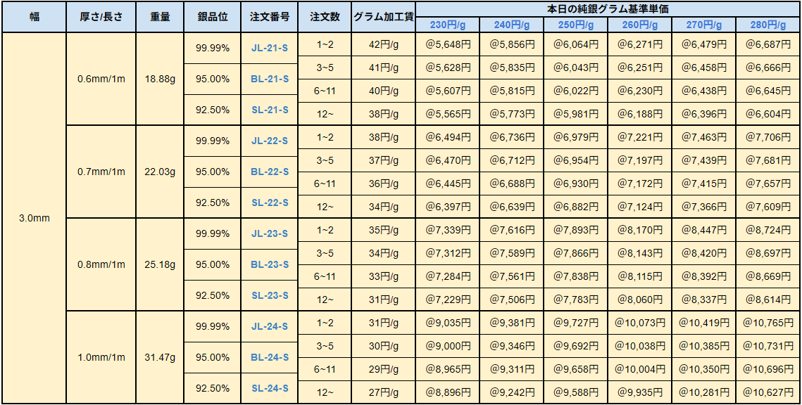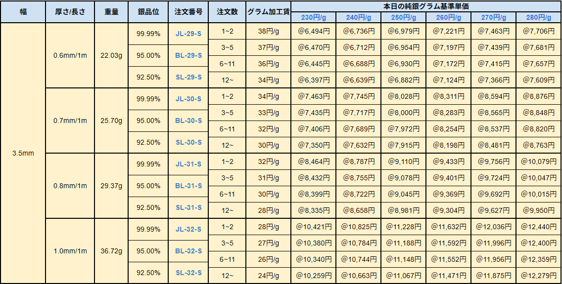 銀板・銀線の価格設定方法 / 品位・配合について