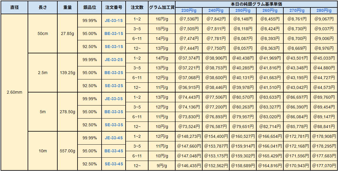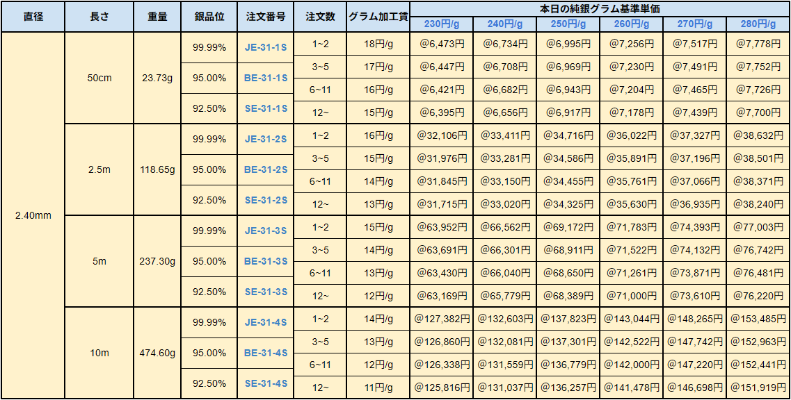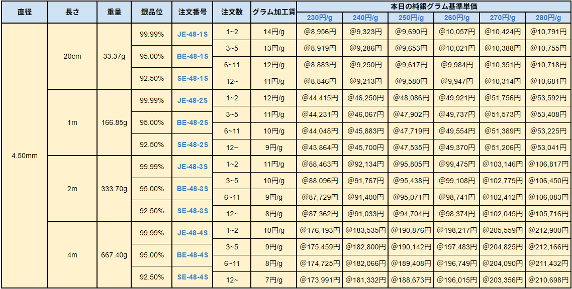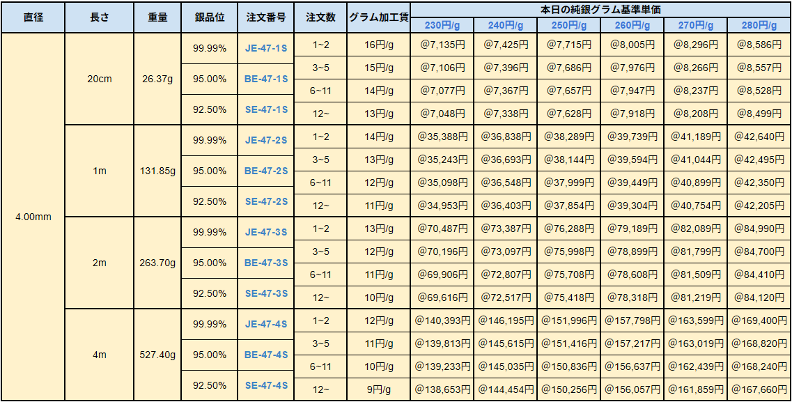 シルバー9999、シルバー950、シルバー925ソフトワイヤーの販売価格は、4N純銀をベースに計算されています。950銀、925銀は同一価格での販売となります。