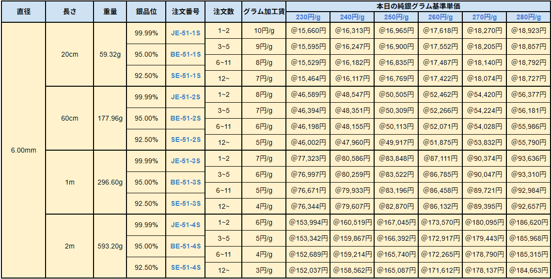 ※重量は4N純銀の比重(10.49)で計算しています。重量は計算重量のため実際の重量とは多少異なります。