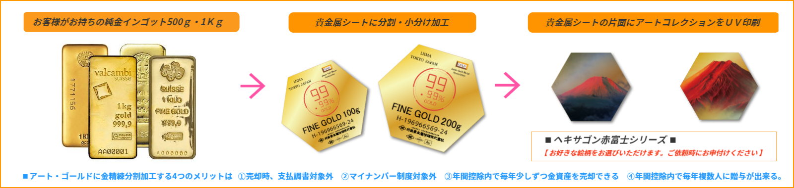 ★ お客様がお持ちの500g・1kg 純金インゴットを分割・小分け加工し、50g・100g・200g・250gの 特定品アート コレクション シートに!