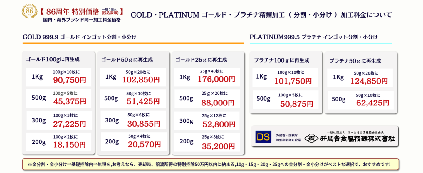 ★貴金属 地金商の井島貴金属精錬㈱の東京工場で直接受付・直接加工するからこそ加工代金に関して[ 公正で適正な価格 ]を実現できています!★