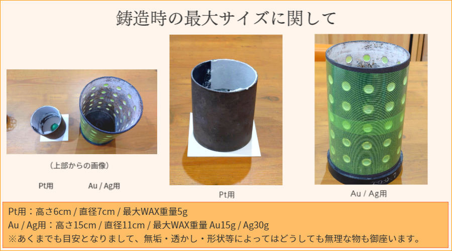 ※バングル等の重量がある物は物理的に1点につき1筒での鋳造となりますので、1筒加工代金を適用させて頂きます。