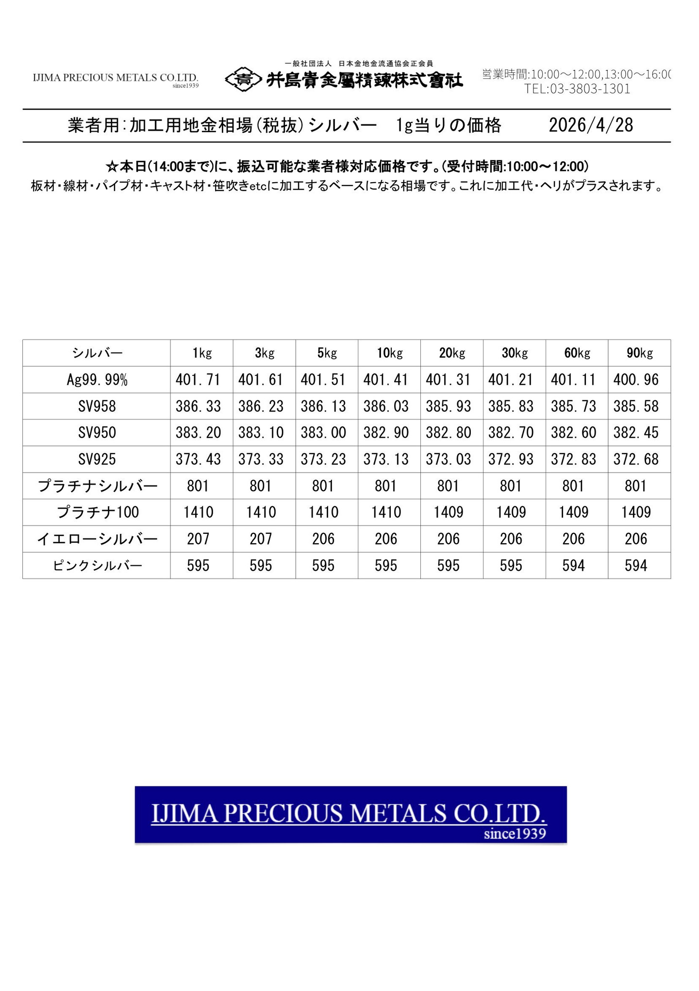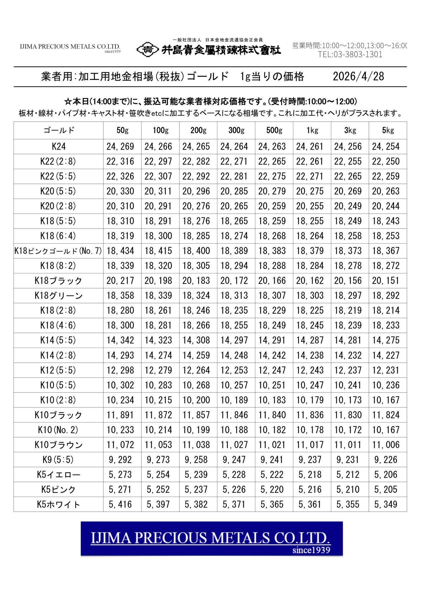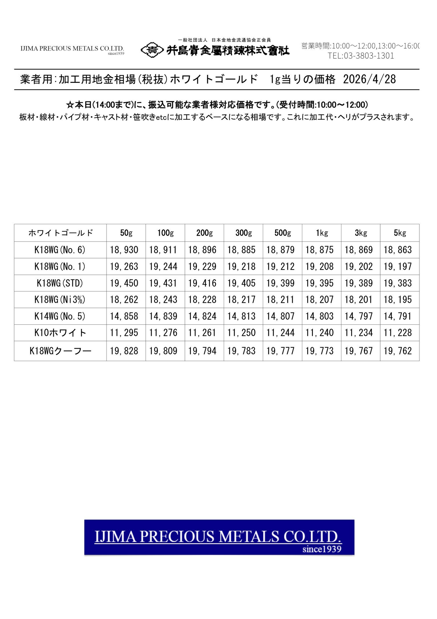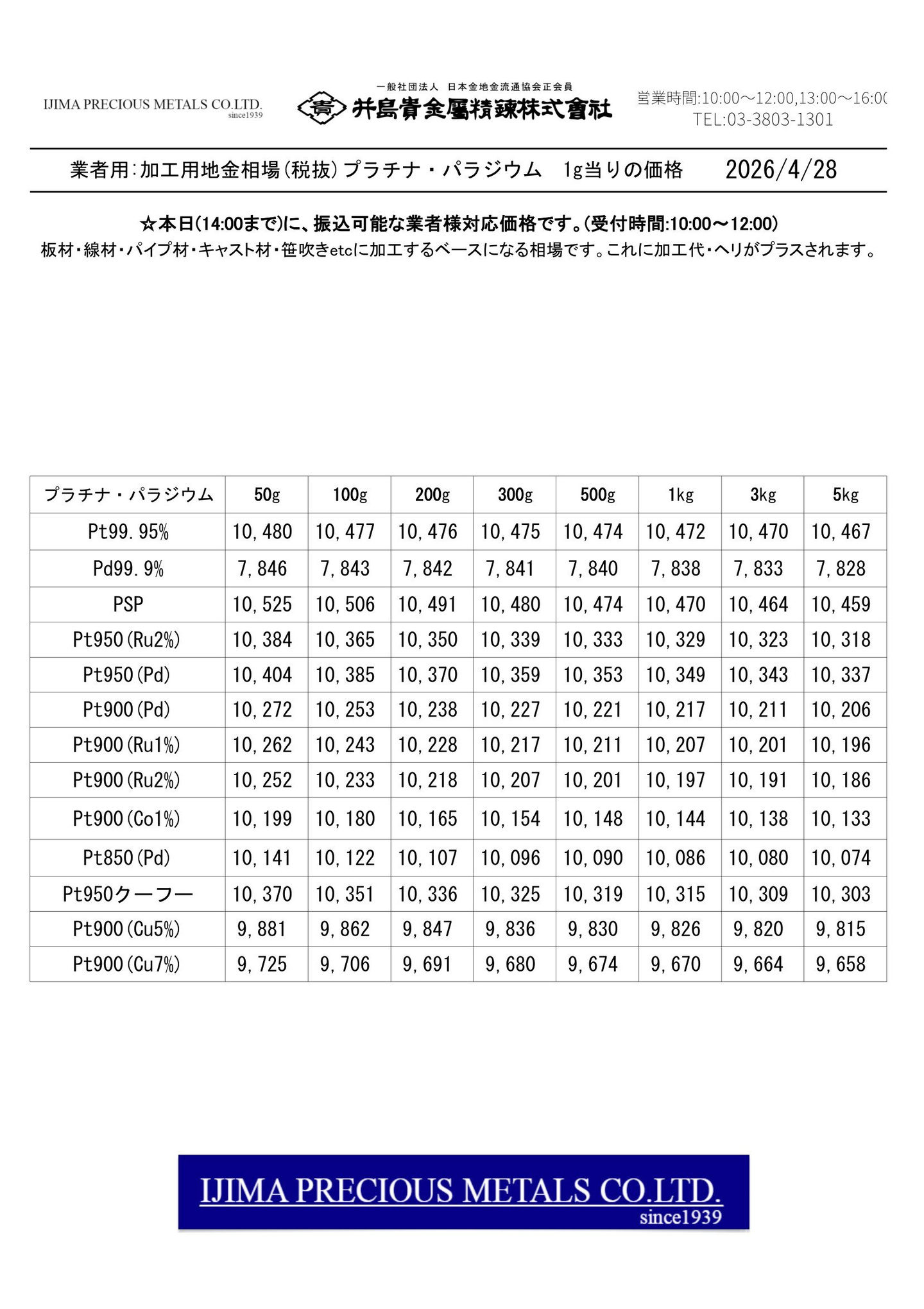 ◆◆◆◆井島貴金属精錬株式会社:加工用 貴金属合金 全51種の価格◆◆◆◆