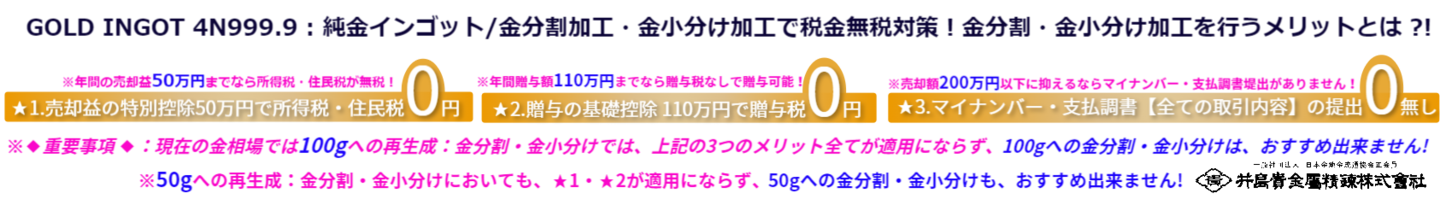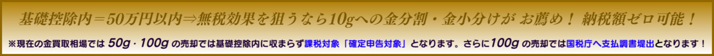 ※金以外の譲渡益がない場合、25gなら現在の金相場なら無税、100gでは現在の金相場では課税対象、50gでも金相場の上昇しだいで10,703円/gから課税対象。ただし500g・1Kg売却に比べたら大幅な節税になります。