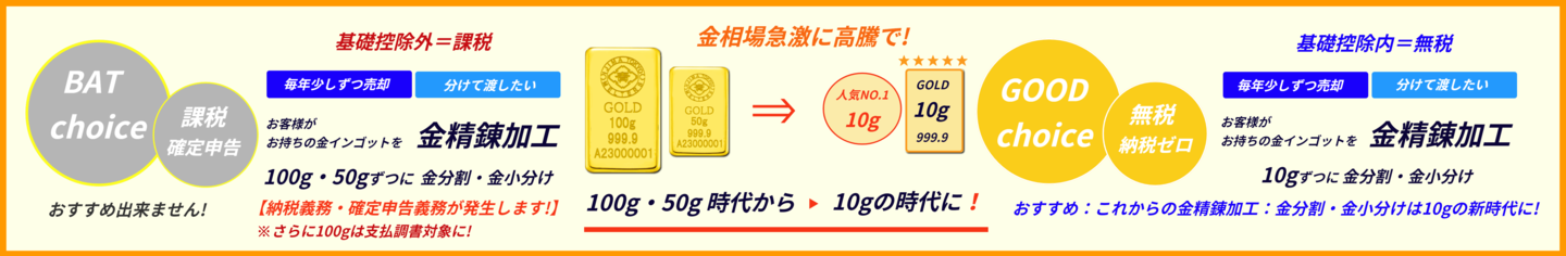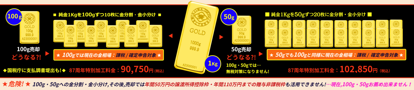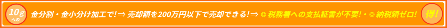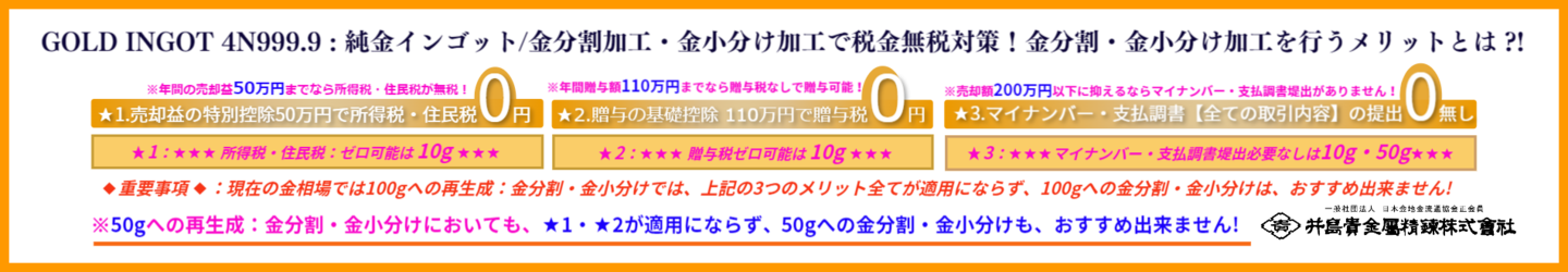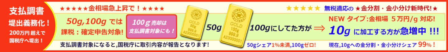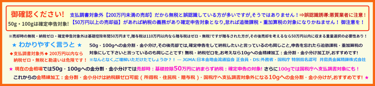 ※譲渡益が出た場合は自己申告し,納税の義務は発生します。ただし年間の特別控除の50万円以内なら納税の義務はありません。⇒25gへの金分割・金小分けが無税で安心・安全です!50gへの金分割・金小分けでは金買取価格10,703円/gから課税対象です! 100gの売却では完全に課税対象です!⇒確定申告の義務が発生します!