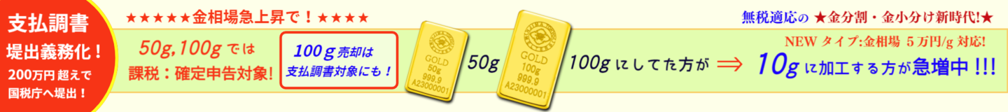 上昇すると⇒目安:買取価格⇒10,703円/gで確定申告対象になるので50g・100gに金分割・金小分け加工したものを