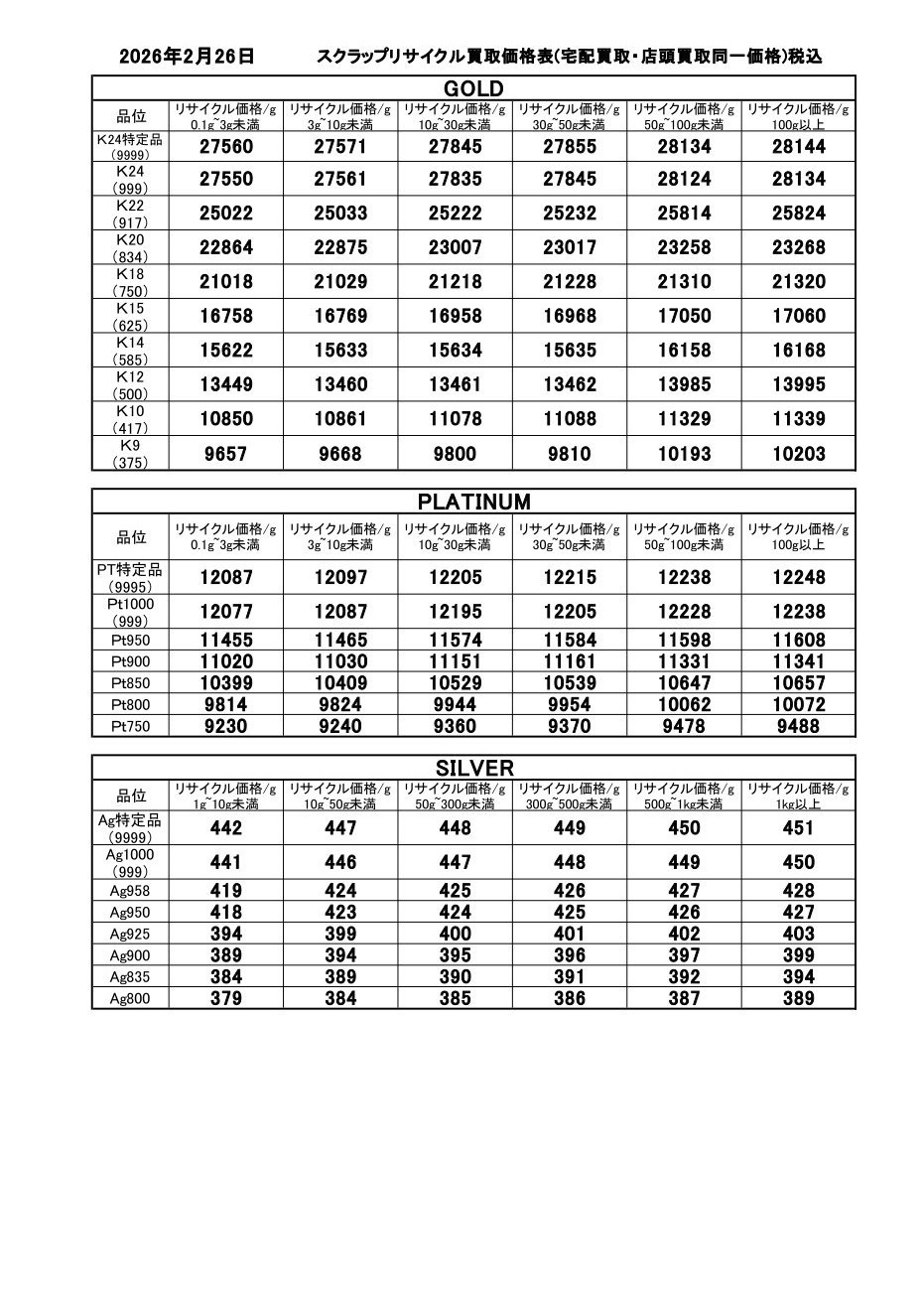 ※下記価格は宅配買取・店頭買取における金製品0.1g・プラチナ製品0.1g・銀製品1g以上に対しての適用価格(税込)です