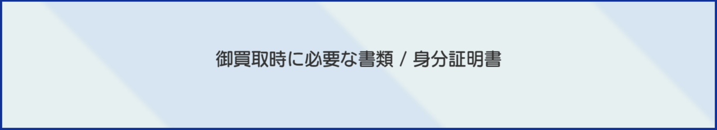 | ご本人 | 購入 | ①本人確認書の確認 ※個人事業者の本人確認書とは 個人事業主として事業を営んでいる事を証明する本人確認書は2通が必要となります。 ◆証明書類◆ ◎古物商許可書◎納税証明書◎青色または白色申告書◎所得税青色申告承認申請書◎所得税青色申告決算書◎収支内訳書◎消費税確定申告書◎国税電子申告納税(e-tax)受信通知および申告データ出力分 ①屋号、住所、代表者の記載があるもの ②行政機関の発行印・1年以内の発行日付があるもの ③有効期間の記載がある場合、有効期間内であるもの ④有効期間の記載がない場合、1年以内のものであること | ①本人確認書類の確認・記録、コピーの取得 ※個人事業者の本人確認書とは 個人事業主として事業を営んでいる事を証明する本人確認書は2通が必要となります。 ◆証明書類◆ ◎古物商許可書◎納税証明書◎青色または白色申告書◎所得税青色申告承認申請書◎所得税青色申告決算書◎収支内訳書◎消費税確定申告書◎国税電子申告納税(e-tax)受信通知および申告データ出力分 ①屋号、住所、代表者の記載があるもの ②行政機関の発行印・1年以内の発行日付があるもの ③有効期間の記載がある場合、有効期間内であるもの ④有効期間の記載がない場合、1年以内のものであること |