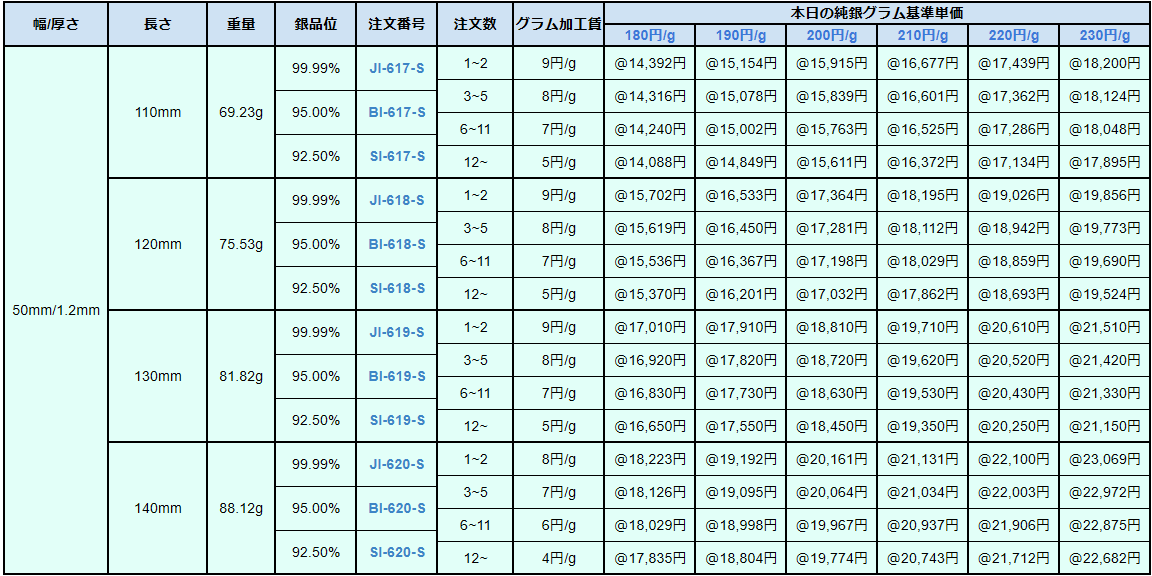 シルバー9999、シルバー950、シルバー925ソフトシートの販売価格は、4N純銀をベースに計算されています。950銀、925銀は同一価格での販売となります。