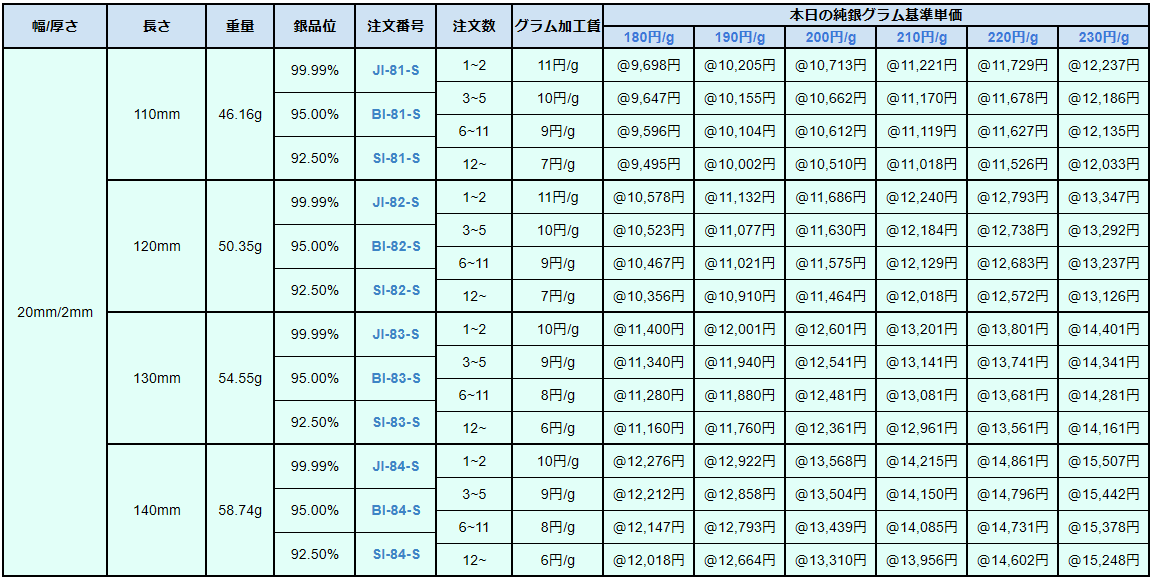 シルバー9999、シルバー950、シルバー925ソフトシートの販売価格は、4N純銀をベースに計算されています。950銀、925銀は同一価格での販売となります。