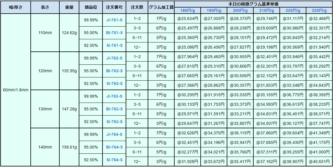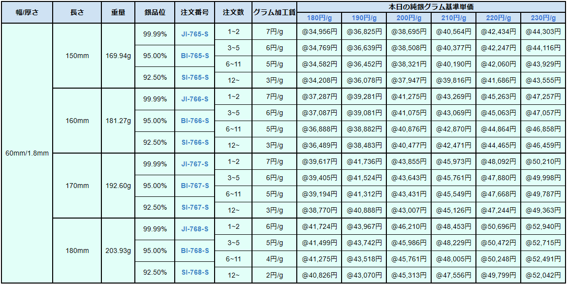 シルバー9999、シルバー950、シルバー925ソフトシートの販売価格は、4N純銀をベースに計算されています。950銀、925銀は同一価格での販売となります。