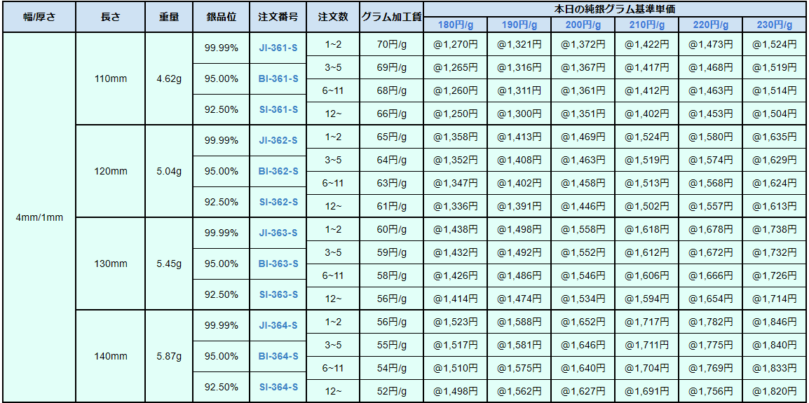 シルバー9999、シルバー950、シルバー925ソフトシートの販売価格は、4N純銀をベースに計算されています。950銀、925銀は同一価格での販売となります。