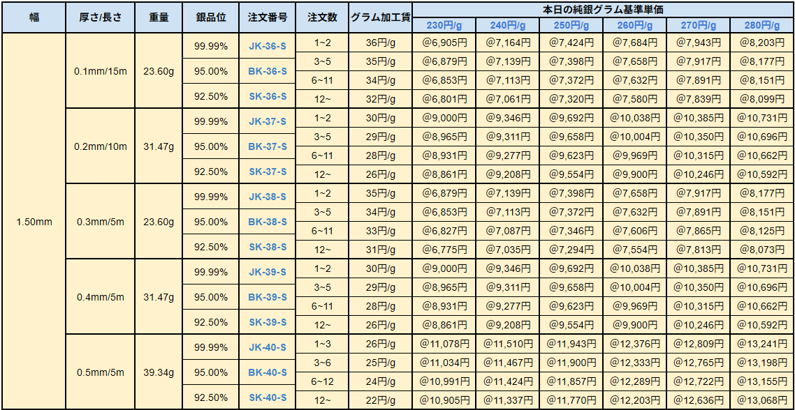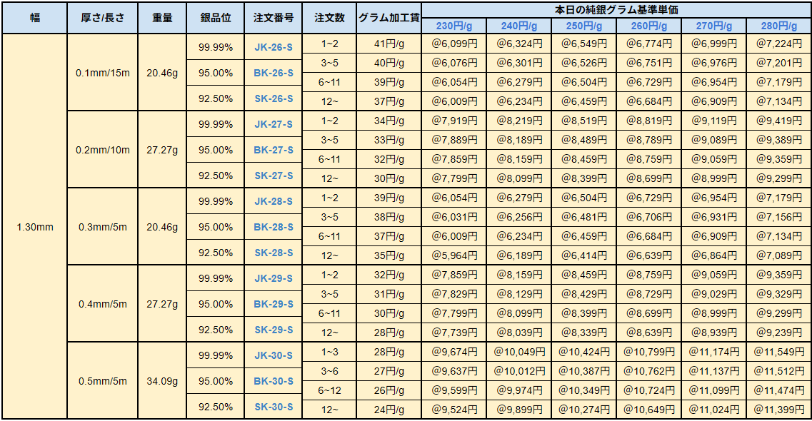 シルバー9999、シルバー950、シルバー925ソフトシートの販売価格は、4N純銀をベースに計算されています。950銀、925銀は同一価格での販売となります。