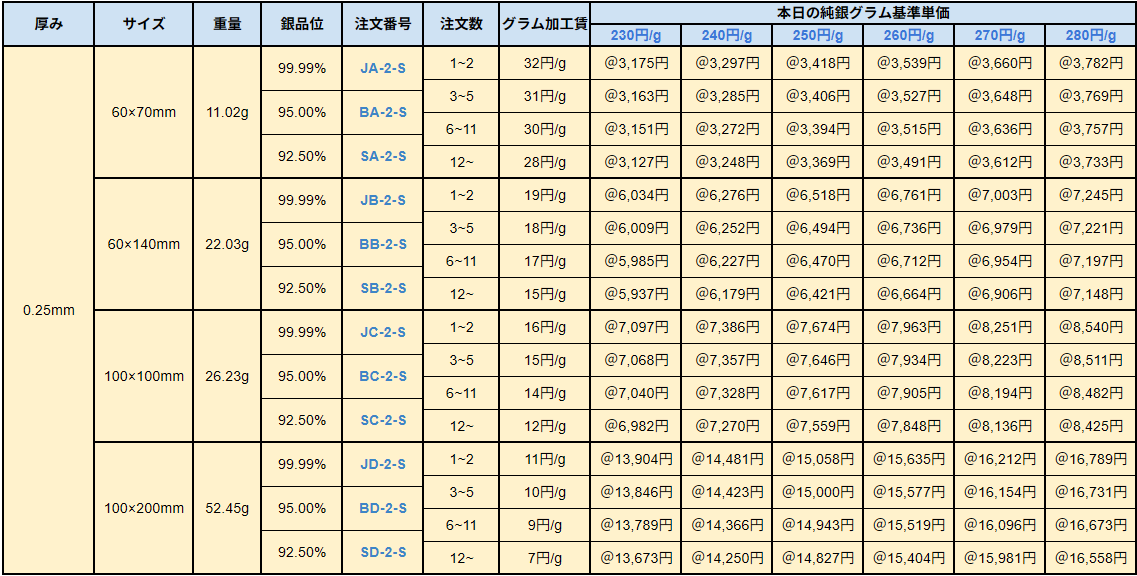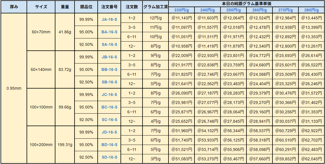 シルバー9999、シルバー950、シルバー925ソフトシートの販売価格は、4N純銀をベースに計算されています。950銀、925銀は同一価格での販売となります。