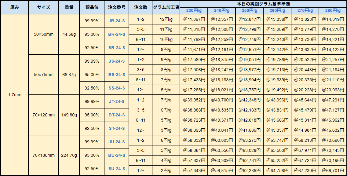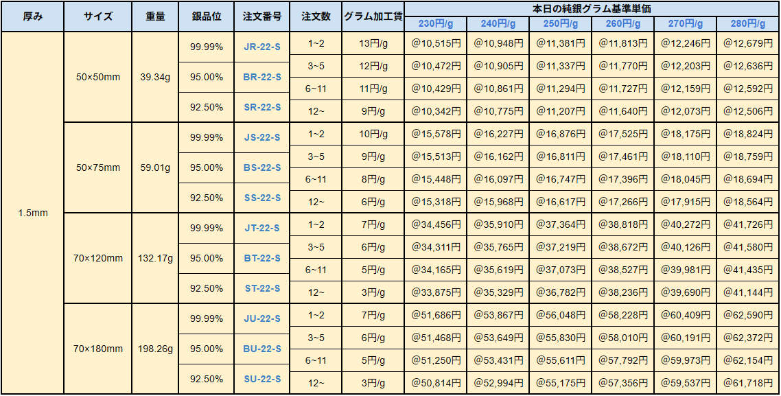 シルバー9999、シルバー950、シルバー925ソフトシートの販売価格は、4N純銀をベースに計算されています。950銀、925銀は同一価格での販売となります。