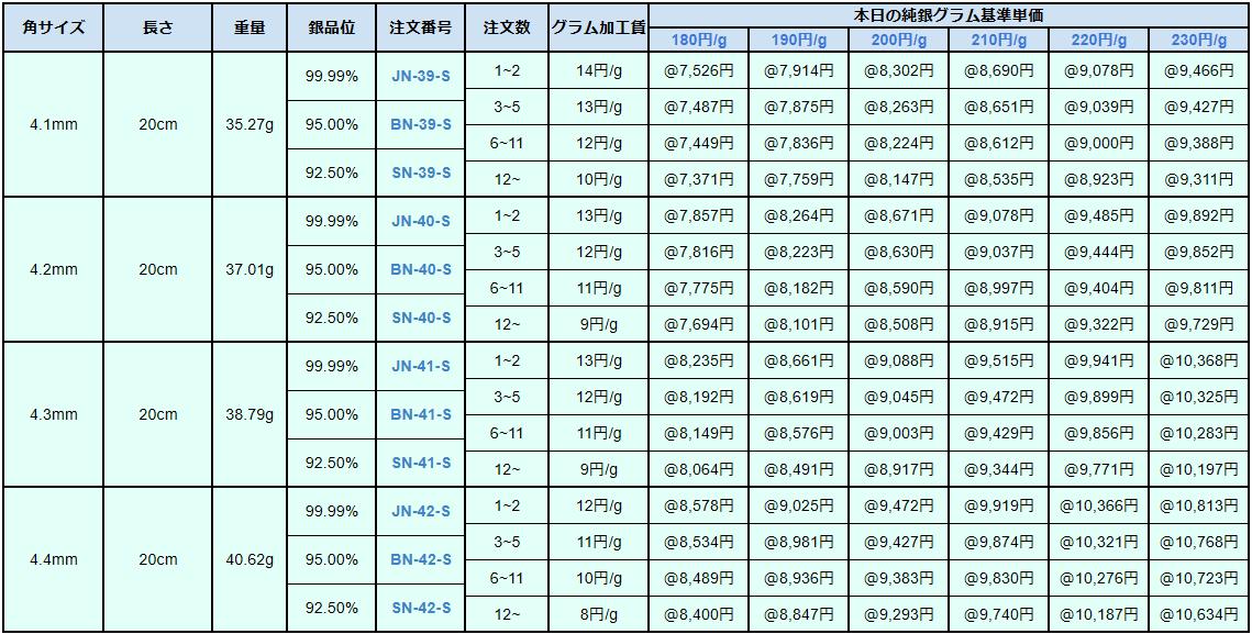 ※重量は4N純銀の比重(10.49)で計算しています。重量は計算重量のため実際の重量とは多少異なります。