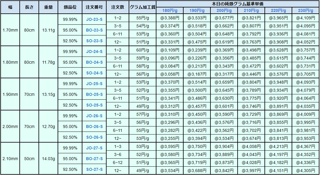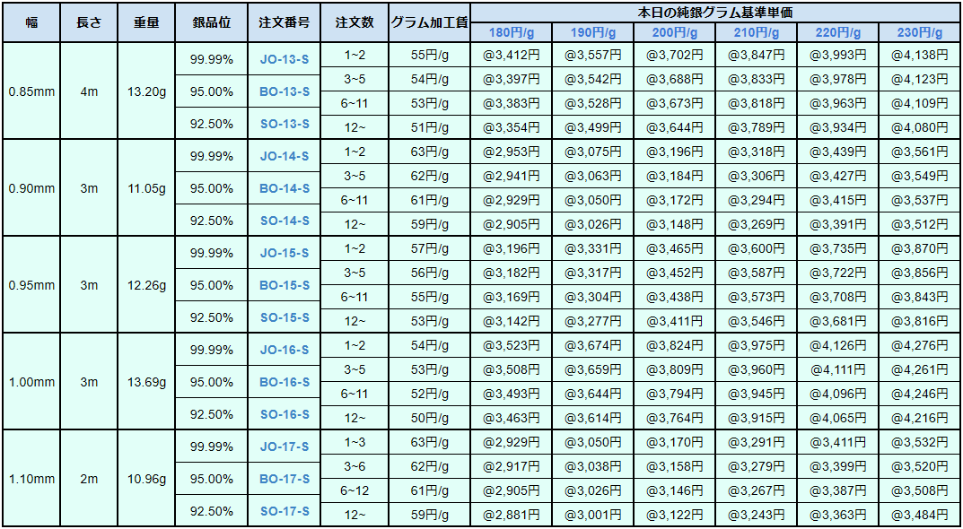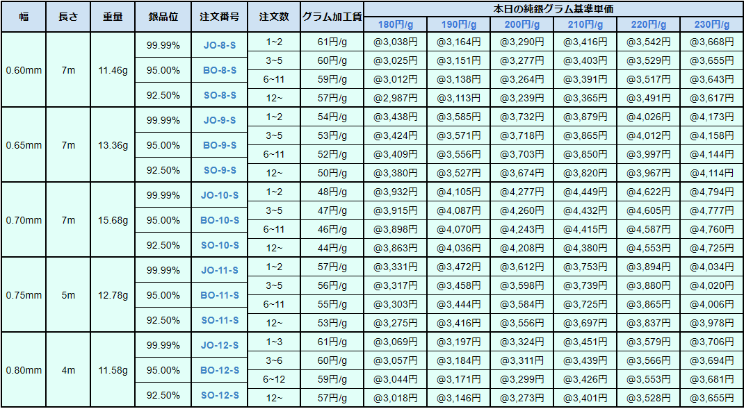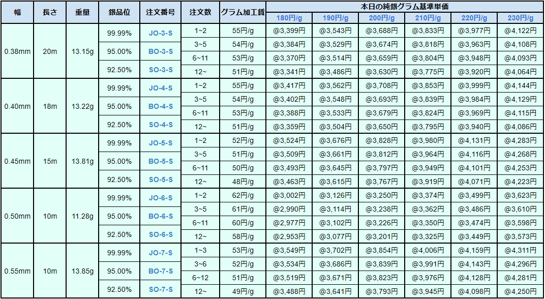 シルバー9999、シルバー950、シルバー925ソフトシートの販売価格は、4N純銀をベースに計算されています。950銀、925銀は同一価格での販売となります。