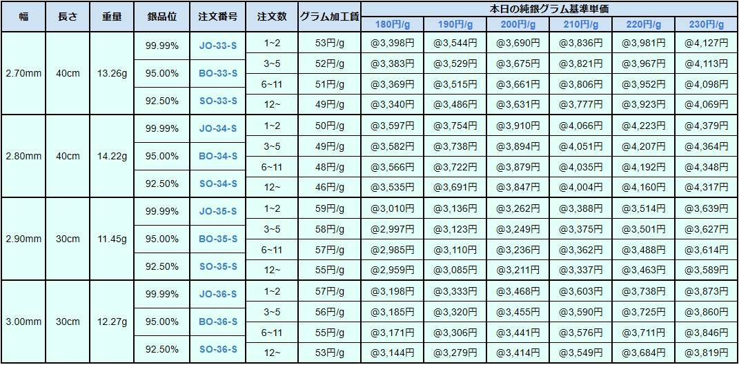 ※重量は4N純銀の比重(10.49)で計算しています。重量は計算重量のため実際の重量とは多少異なります。
