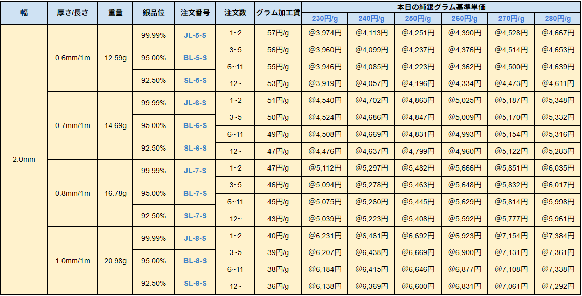 銀板・銀線の価格設定方法 / 品位・配合について