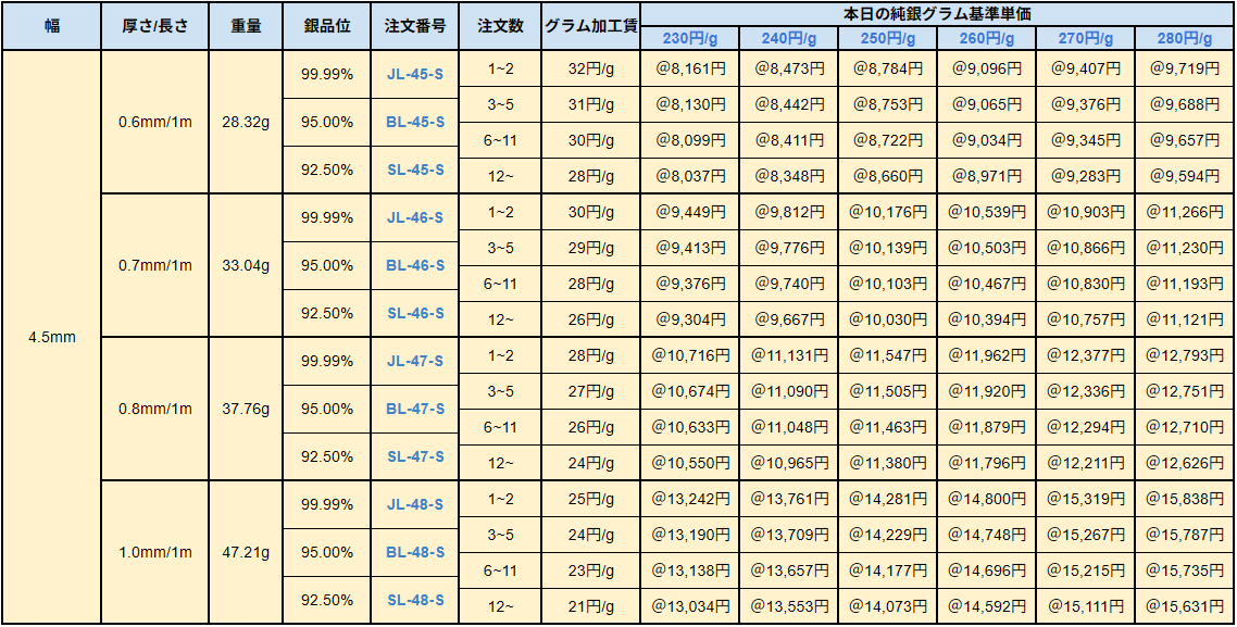 シルバー9999、シルバー950、シルバー925ソフトシートの販売価格は、4N純銀をベースに計算されています。950銀、925銀は同一価格での販売となります。