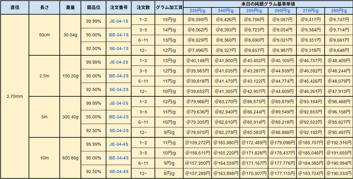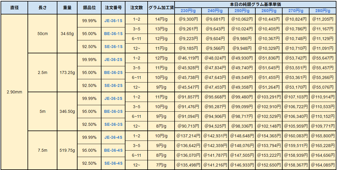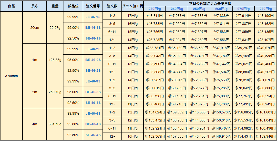 シルバー9999、シルバー950、シルバー925ソフトワイヤーの販売価格は、4N純銀をベースに計算されています。950銀、925銀は同一価格での販売となります。