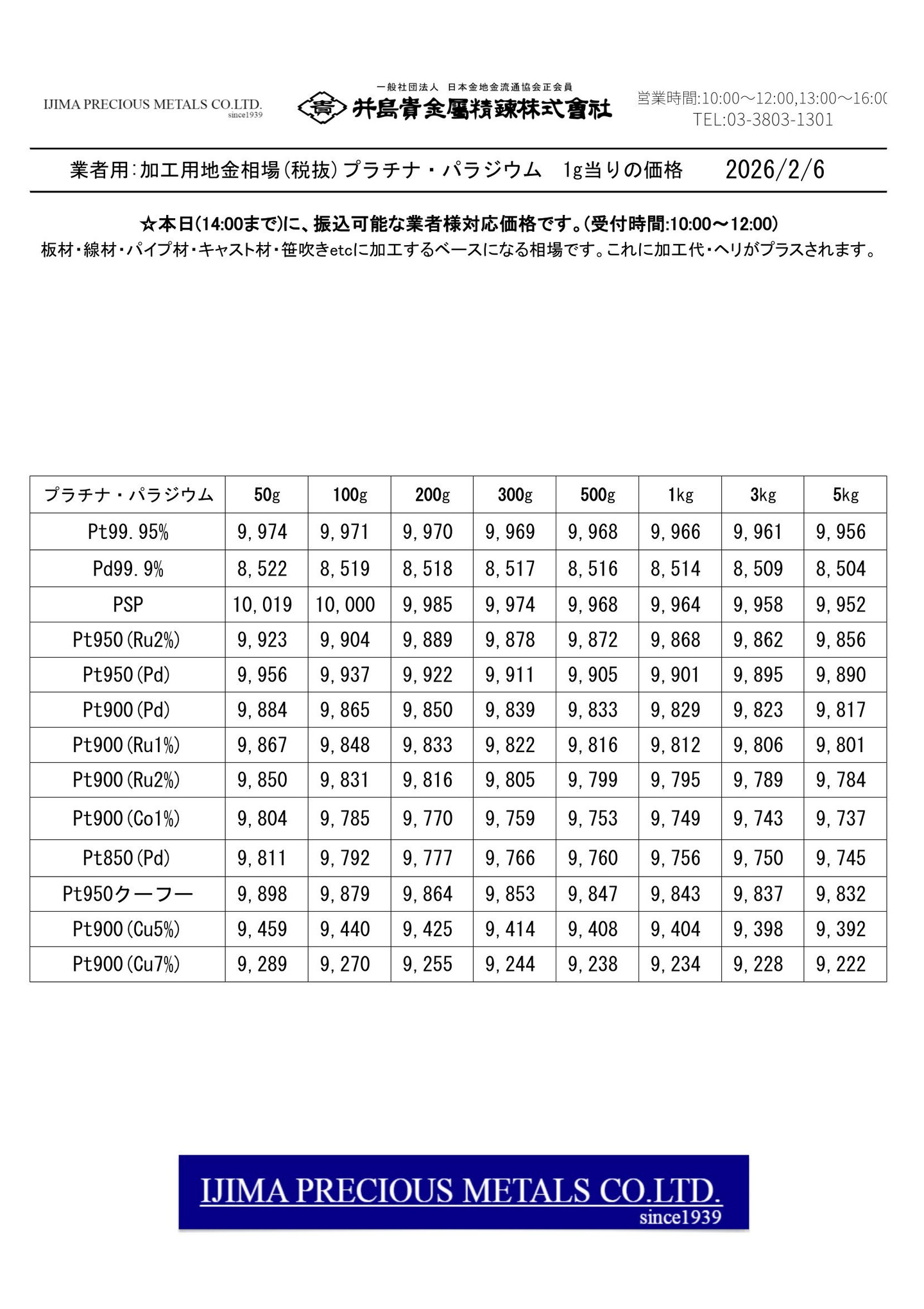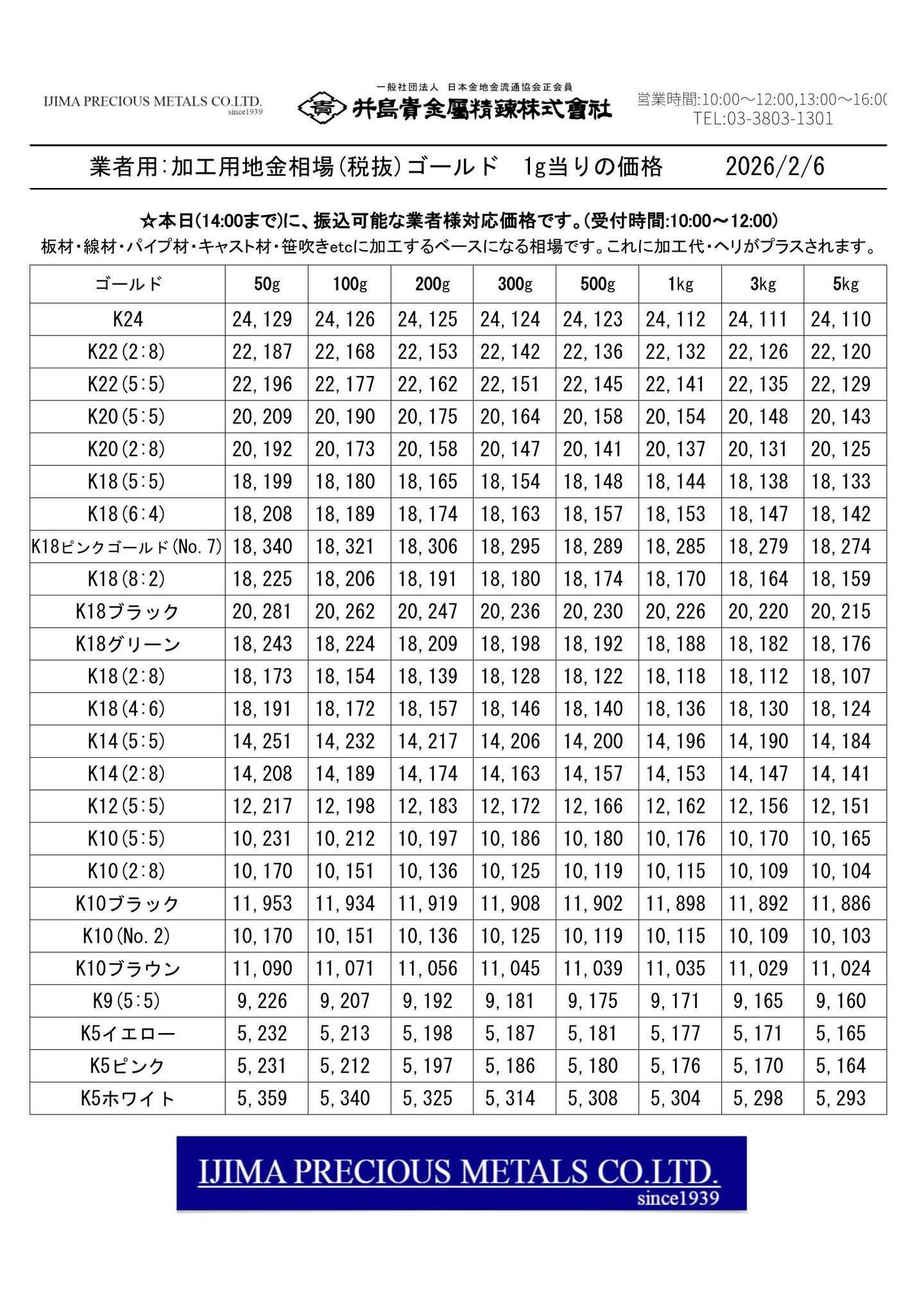 ◆◆◆◆井島貴金属精錬株式会社:加工用 貴金属合金 全51種の価格◆◆◆◆
