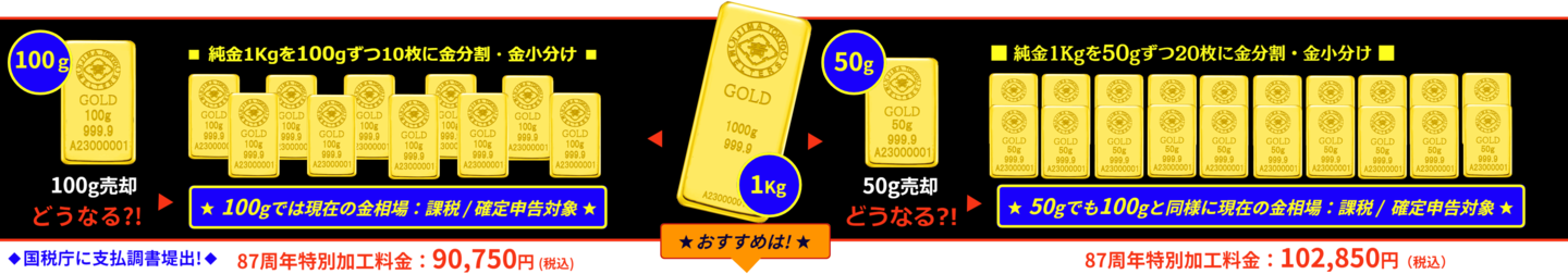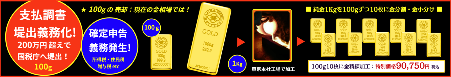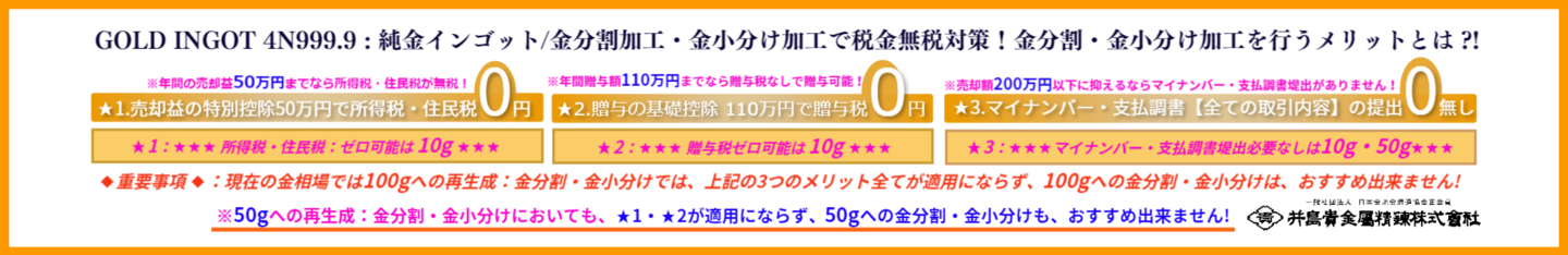 ※譲渡益が出た場合は自己申告し,納税の義務は発生します。ただし年間の特別控除の50万円以内なら納税の義務はありません。⇒25gへの金分割・金小分けが無税で安心・安全です!50gへの金分割・金小分けでは金買取価格10,703円/gから課税対象です! 100gの売却では完全に課税対象です!⇒確定申告の義務が発生します!